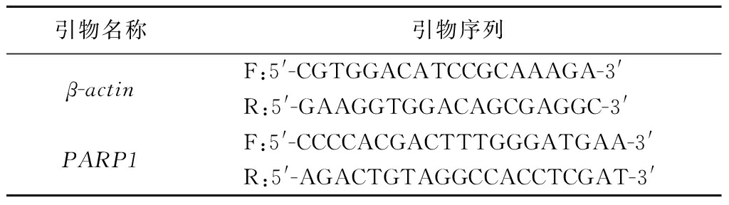 引物名称引物序列β-actinF:5'-CGTGGACATCCGCAAAGA-3'R:5'-GAAGGTGGACAGCGAGGC-3'PARP1F:5'-CCCCACGACTTTGGGATGAA-3'R:5'-AGACTGTAGGCCACCTCGAT-3'