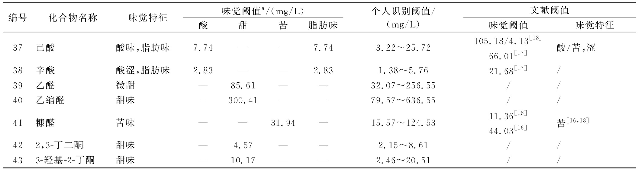 注:a共15位品评员参与了阈值测定,表中味觉阈值为15位品评员个人识别阈值的几何平均值,味觉阈值是在体积分数为46%的乙醇水溶液中采用3-AFC测定;—表示无测定数据;/表示未检索到相关文献数据。