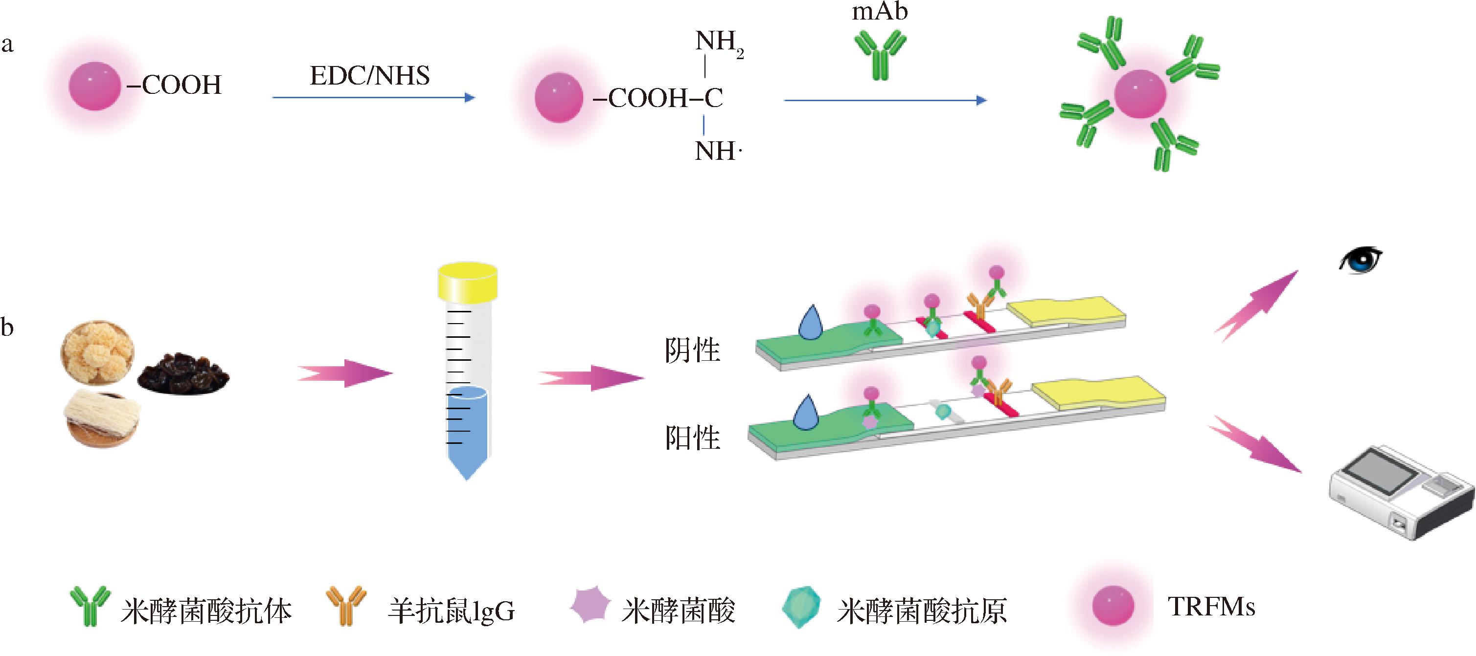 相对于传统仪器法,快速检测法具有快速、简便,对仪器依赖度低,成本低,便于携带以及对操作人员技术要求低等特点,适合较为紧急的现场检查以及大规模样品速筛等检测工作。目前国内外的针对食品基质的快速检测方法主要有酶抑制法、酶联免疫法、生物传感器法、光谱法等。其中酶抑制法主要利用的是特定酶与目标药物特异性结合的原理,来实现快速定性或半定量检测的目的。如目前有报道利用乙酰胆碱酯酶来检测有机磷或氨基甲酸酯类农药[7]。酶联免疫法是基于抗原抗体特异性结合以及结合后的复合物能够被识别和检测的原理[8]。根据不同的检验方法可以分为直接法、间接法和夹心法等,方法的选择需要综合考量。例如采用直接法,该检验方法是利用带酶标的一抗直接与抗原结合,最后加入底物显色并检测吸光度。直接法具有操作简单的优点,同时可以避免抗原和二抗发生交叉反应导致的结果错误,但是所采用的检测抗体既要保证免疫活性又要标记酶标信息,制备困难且成本较高。生物传感器法是利用酶、抗体、线粒体等生物活性物质来识别检测物质,通过传感器将反应中的理化反应转化为电信号并放大的以达到检测目的的一种快检方法[9]。该种方法可以用于检测食品中的农药残留、微生物及其代谢物等指标,保卫食品安全。光谱法主要是通过分析样品的光谱特征的主要用于定性检测的方法,其特点是操作简单,无需样品制备,在线分析[10]。但是该方法在灵敏度、抗干扰能力方面存在较为严重的技术缺陷,从而大大限制了其发展。免疫层析方法是快速检测法的一种,目前常见的免疫层析法的主要标记材料有胶体金、乳胶微球及时间分辨荧光微球等[11]。目前已有报道利用胶体金对米酵菌酸进行快速检测的方法[12-13],胶体金灵敏度较低、定量范围较窄以及不稳定[14],在实际应用过程中无法准确定量,多用于定性测定,且定性检测限较高使其在检测应用中常出现假阴性现象。而对比于胶体金,乳胶微球颜色丰富、大小均匀、比表面积较大,提供更多的结合位点,能够满足更多的检测要求,有更高的稳定性,但无法做到屏蔽干扰[15]。时间分辨荧光微球是由镧系元素及螯合物组成的微粒,镧系元素具有荧光寿命长,stokes位移大以及发射光谱窄的特点,这使得时间分辨荧光微球用于免疫分析技术时,可以有效避免短寿命背景荧光对检测结果的干扰,从而提高检测方法的信噪比和灵敏度,实现高信噪比。此外,镧系元素还有stokes位移大的特点,即发射光谱与激发光谱存在较大的波长差,通过对其波长和时间2个参数进行测量,能够很好的屏蔽掉非特异性荧光的干扰,并可重复多次测定[16-17]。综上说明,时间分辨荧光微球非常适用于应用到免疫层析技术当中,不仅可以提高检测方法的灵敏度和准确性,实现“又快又准”,还可以保证在出现可疑结果并对免疫层析试纸条进行回顾时,由于短寿命背景荧光的湮灭,结果“更加准确”。