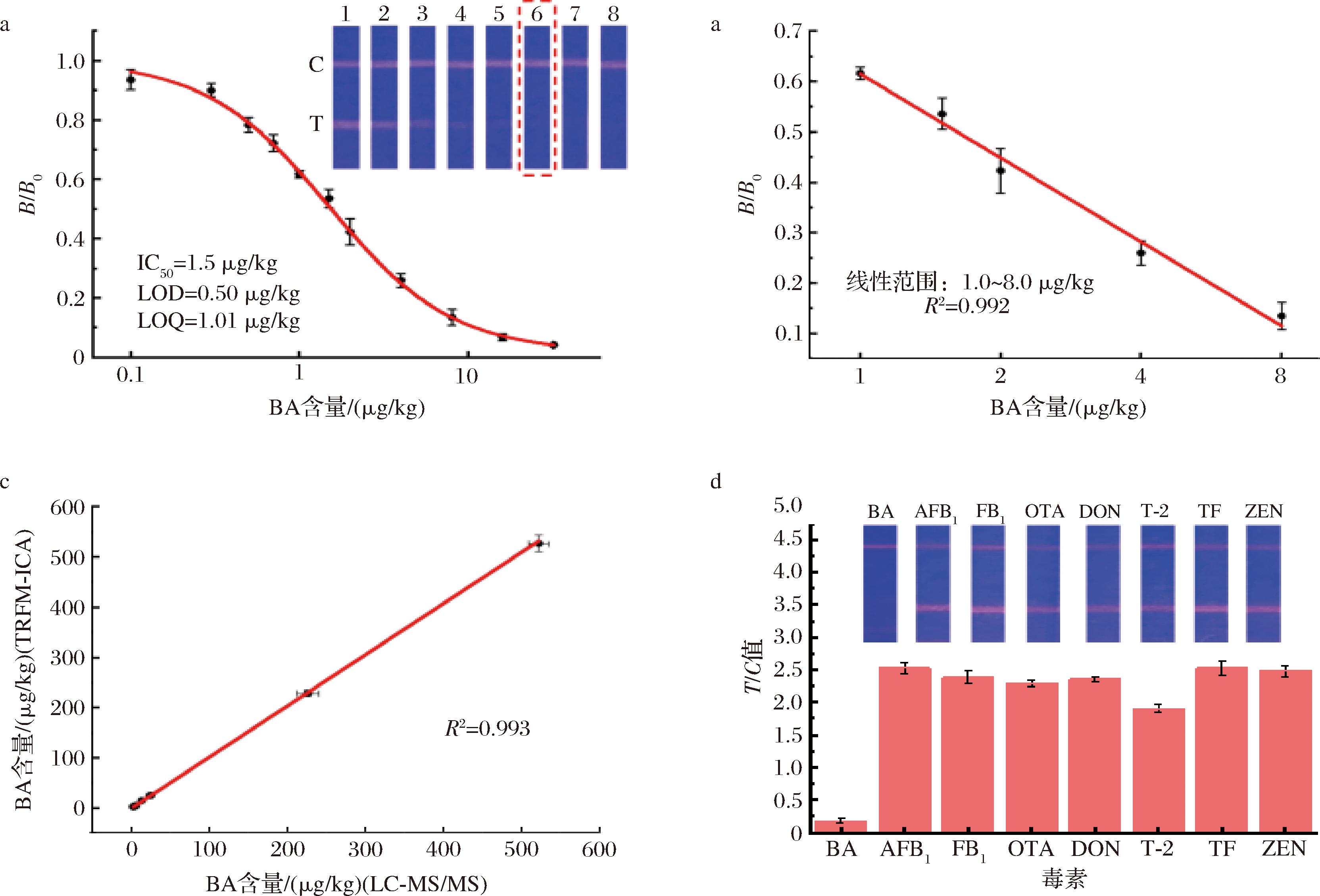以线性检出范围、cut-off值、检测限(limit of detection,LOD)和定量限(limit of quantitation,LOQ)值来评价该检测方法的灵敏度。用PB制备0、0.1、0.3、0.5、0.7、1.0、1.5、2.0、4.0、8.0、16.0 μg/kg系列浓度米酵菌酸溶液,每个水平重复检测3次。使T线消失的最低浓度为cut-off值。如图4-a所示,当BA含量达到6 μg/kg时,试纸条上的T线消除,因此cut-off值为6.0 μg/kg。测定各浓度的B/B0值(B是阳性样品的T/C值,B0是阴性样品的T/C值),以浓度的对数为横坐标,其相应的B/B0值为纵坐标,绘制标准曲线,以半抑制(抑制率为50%)浓度为IC50值。