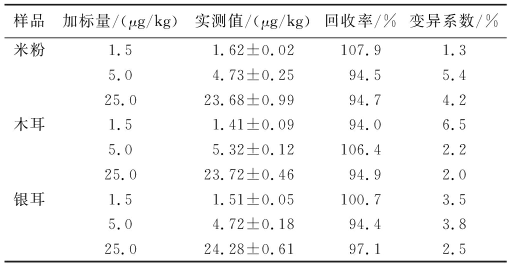 应用项目建立的方法对阴性样品米粉、木耳、银耳进行加标回收实验,选取LOQ值以上的低浓度水平、cut-off浓度邻近值、以及高浓度水平为依据,加标水平分别为1.5、5.0、25.0 μg/kg。分别购买并分批处理共3批次样品,每个批次的每个浓度水平重复检测3次,计算添加回收率,从而说明检测方法在不同批次食品基质间表现出的检测稳定性。其结果如表1所示,3种样品的添加回收率在94.0%~107.9%,变异系数为1.3%~6.5%,这说明数据的波动程度相对较小,变化范围相对有限,检测方法的稳定性和准确性良好,适用于对精度要求较高的场景。在实际的应用场景中,对于准确性和精度要求极高的情况,可先使用本法快速进行大规模筛查,对于可疑样品再进行传统仪器检测法的重复确证。