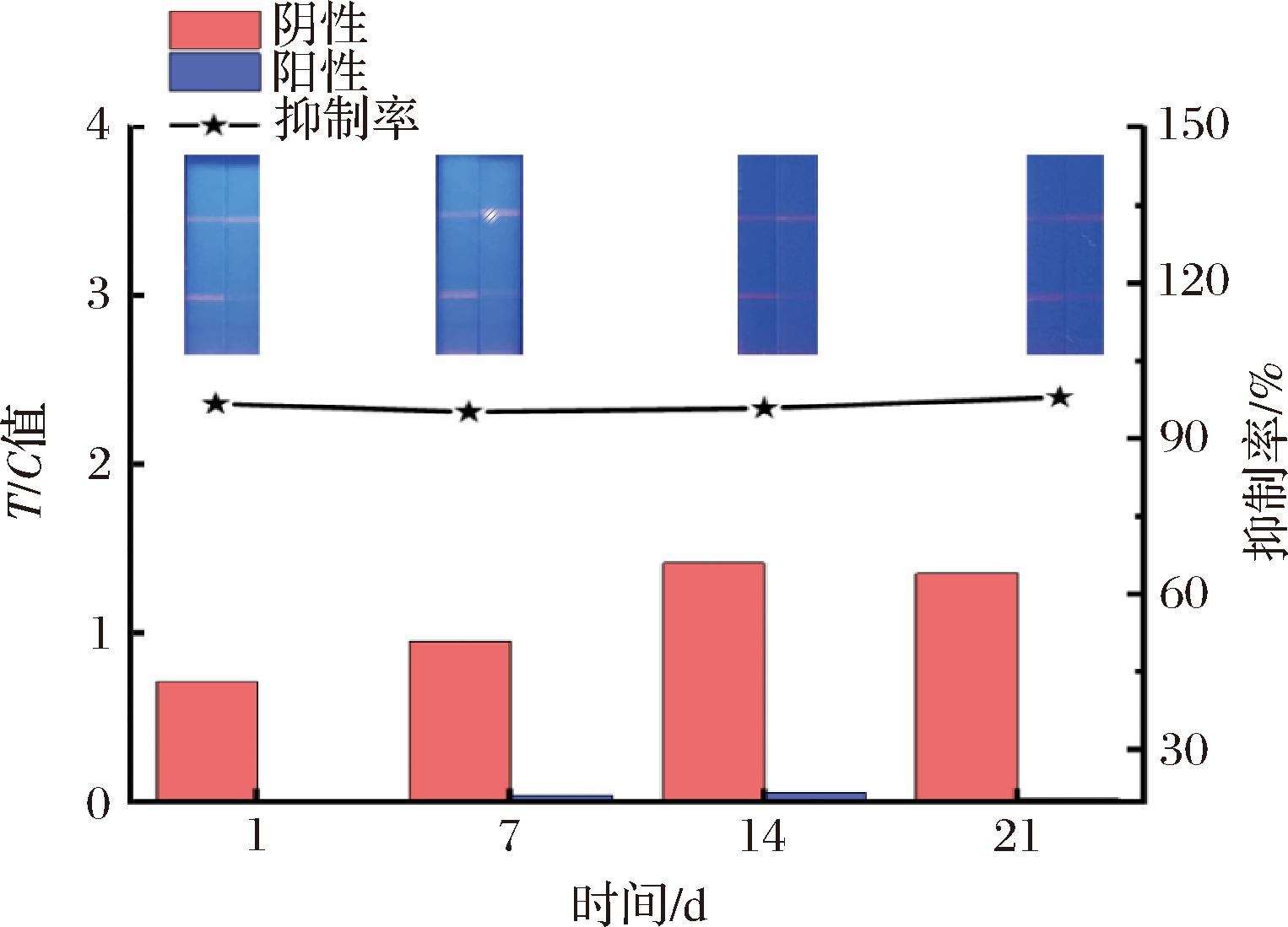 将试纸条置于45 ℃的条件下进行保存,进行加速稳定性实验,图5显示了随着时间推迟,试纸条在相同检测条件下的变化,结果表明试纸条稳定性良好。