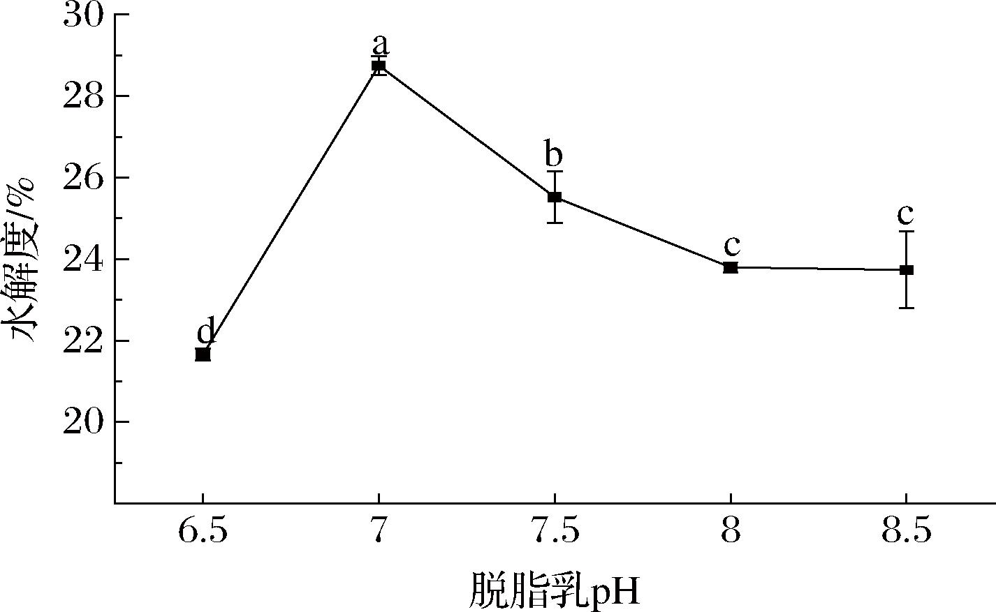 脱脂乳pH:蛋白酶的酶解温度为50 ℃,酶添加量为10 500 U/g,酶解时间4.5 h,考察脱脂乳pH(6.5、7.0、7.5、8.0、8.5)对酶解脱脂乳水解度的影响。