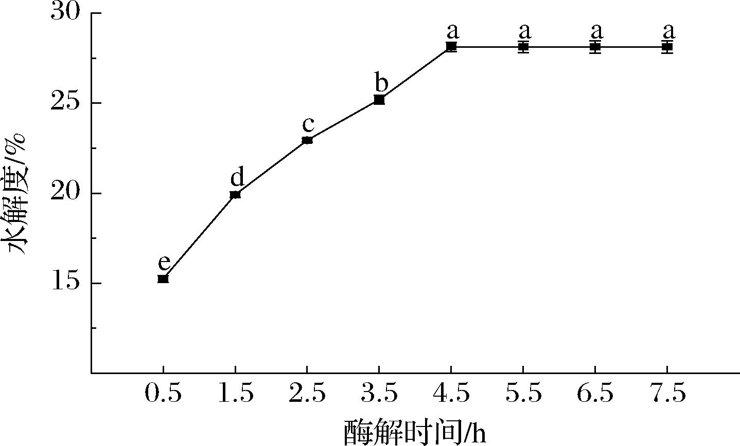 如图2所示,PSM的水解度随酶解时间延长呈先上升后稳定的趋势。PSM在开始的4.5 h内,由于复合蛋白酶酶解反应的底物浓度及酶活力相对较高,有利于酶解的传质过程,因此水解度上升较快,4.5 h时达到最大值,为28%,显著高于3.5 h时的25%(P<0.05);当酶解时间大于4.5 h后,底物浓度及酶活力的降低使得酶促反应的速率逐渐下降,水解度的上升趋势渐缓,酶解曲线接近于平行,PSM在5.5、6.5、7.5 h时的水解度与4.5 h时无显著性差异(P>0.05)。