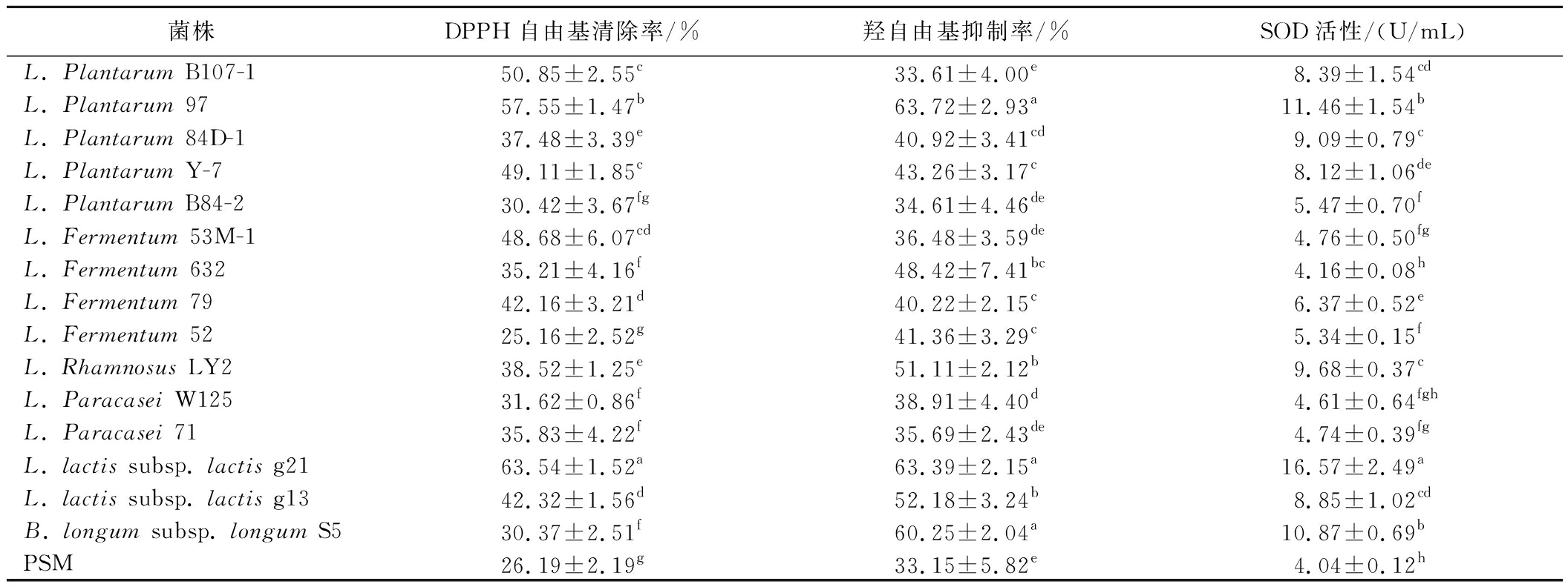 菌株DPPH自由基清除率/%羟自由基抑制率/%SOD活性/(U/mL)L. Plantarum B107-150.85±2.55c33.61±4.00e8.39±1.54cdL. Plantarum 9757.55±1.47b63.72±2.93a11.46±1.54bL. Plantarum 84D-137.48±3.39e40.92±3.41cd9.09±0.79cL. Plantarum Y-749.11±1.85c43.26±3.17c8.12±1.06deL. Plantarum B84-230.42±3.67fg34.61±4.46de5.47±0.70fL. Fermentum 53M-148.68±6.07cd36.48±3.59de4.76±0.50fgL. Fermentum 63235.21±4.16f48.42±7.41bc4.16±0.08hL. Fermentum 7942.16±3.21d40.22±2.15c6.37±0.52eL. Fermentum 5225.16±2.52g41.36±3.29c5.34±0.15fL. Rhamnosus LY238.52±1.25e51.11±2.12b9.68±0.37cL. Paracasei W12531.62±0.86f38.91±4.40d4.61±0.64fghL. Paracasei 7135.83±4.22f35.69±2.43de4.74±0.39fgL. lactis subsp. lactis g2163.54±1.52a63.39±2.15a16.57±2.49aL. lactis subsp. lactis g1342.32±1.56d52.18±3.24b8.85±1.02cdB. longum subsp. longum S530.37±2.51f60.25±2.04a10.87±0.69bPSM26.19±2.19g33.15±5.82e4.04±0.12h