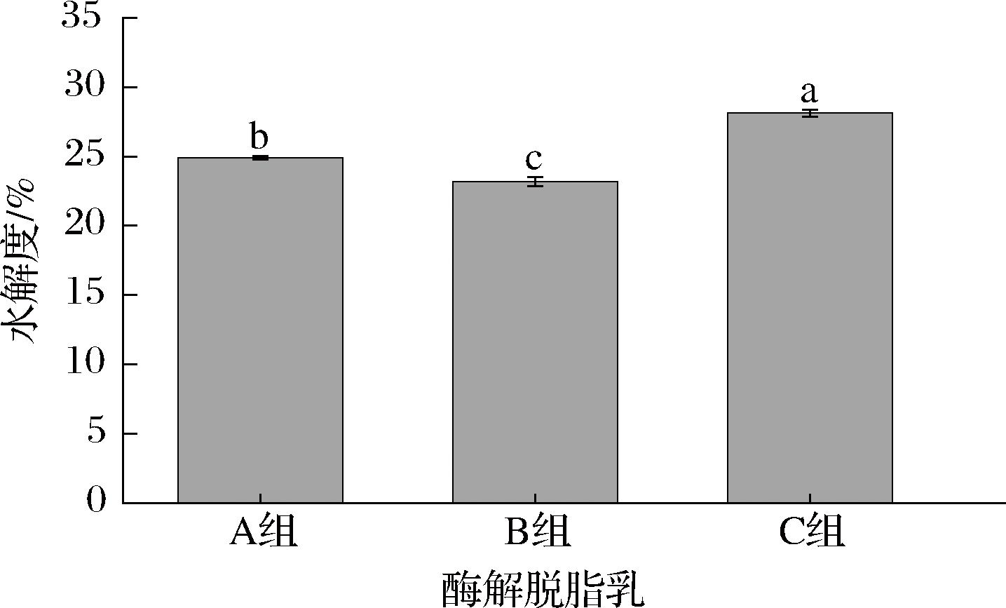 注:A组为中性蛋白酶酶解脱脂乳;B组为风味蛋白酶酶解脱脂乳;C组为PSM;不同字母表示差异显著(P<0.05)(下同)。