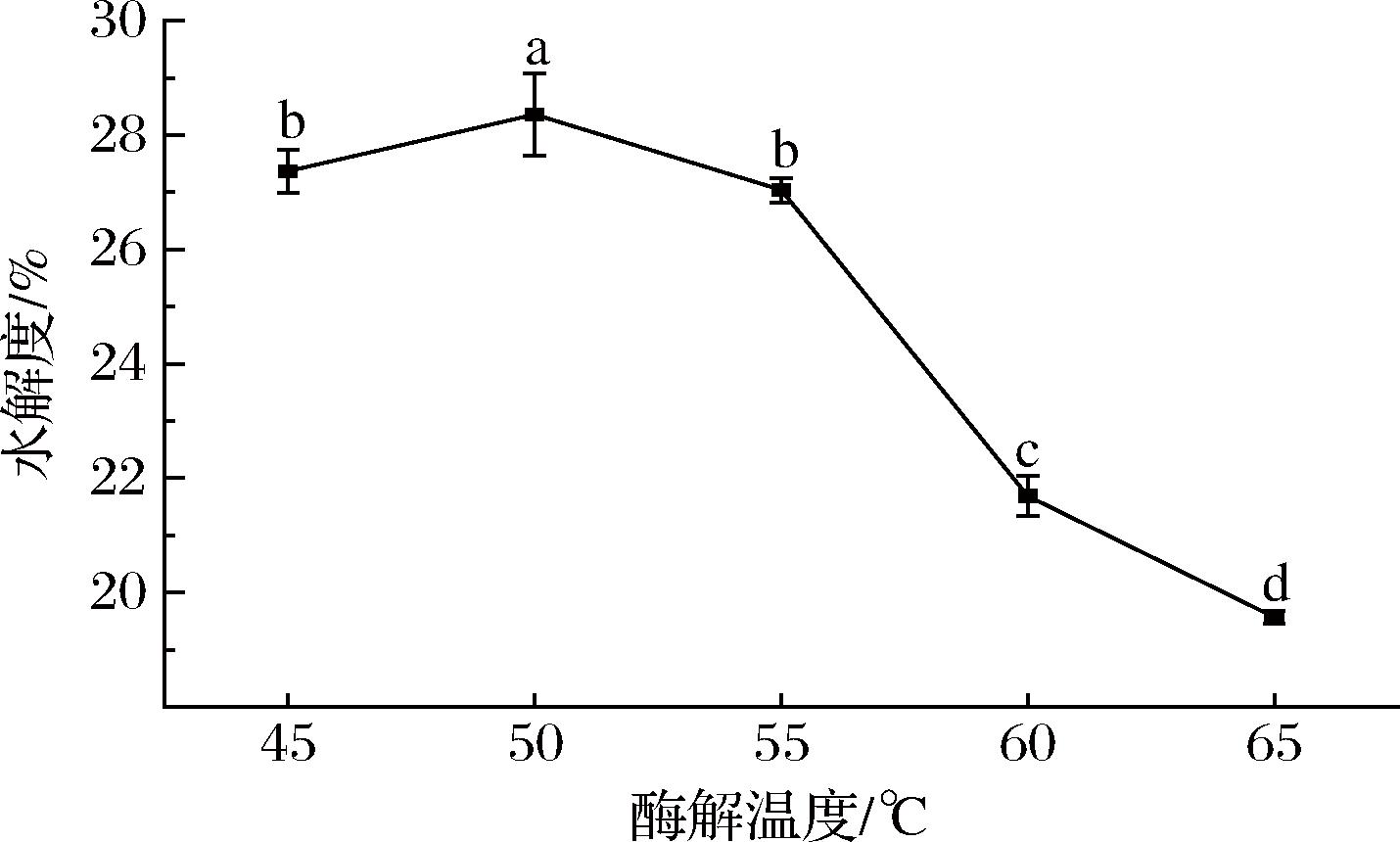 如图4所示,PSM的水解度随酶解温度的增加呈先上升后下降的趋势。在酶解温度为50 ℃时,PSM的水解度达到最大值,为28%,显著高于45 ℃时的27%和55 ℃时的27%(P<0.05);当酶解温度大于50 ℃时,脱脂乳的水解度开始下降,可能是由于高温破坏了复合蛋白酶的结构,导致其变性失活[30]。