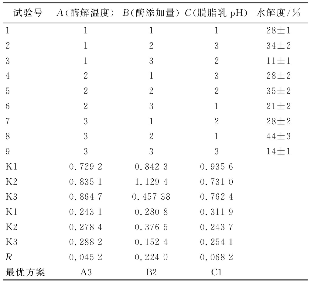 通过单因素试验,确定酶解温度、酶添加量及脱脂乳pH为主要影响因素,以水解度为评价指标,选用L9(33)正交试验对脱脂乳的水解条件进行优化,因素及水平设计见表2。