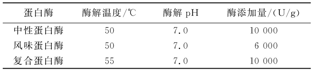 蛋白酶酶解温度/℃酶解pH酶添加量/(U/g)中性蛋白酶507.010 000风味蛋白酶507.06 000复合蛋白酶557.010 000