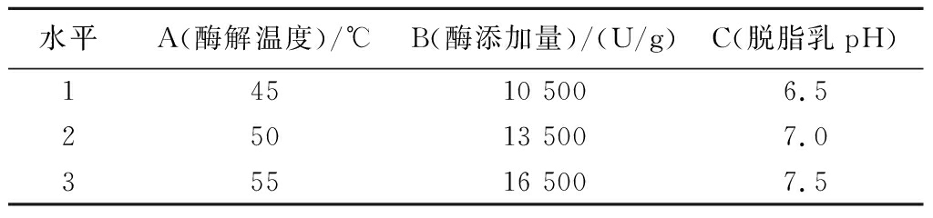 水平A(酶解温度)/℃B(酶添加量)/(U/g)C(脱脂乳pH)14510 5006.525013 5007.035516 5007.5