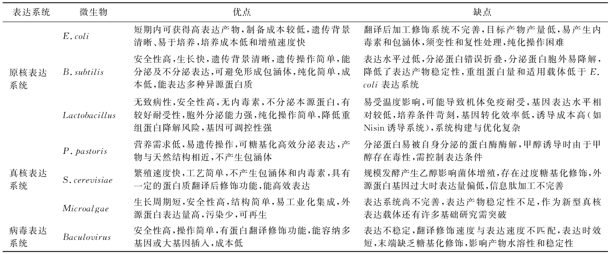表达系统微生物优点缺点原核表达系统E.coli短期内可获得高表达产物,制备成本较低,遗传背景清晰、易于培养,培养成本低和增殖速度快翻译后加工修饰系统不完善,目标产物产量低,易产生内毒素和包涵体,须变性和复性处理,纯化操作困难B.subtilis安全性高,生长快,遗传背景清晰,遗传操作简单,能分泌及不分泌表达,可避免形成包涵体,纯化简单,成本低,能表达多种异源蛋白质表达水平过低,分泌蛋白错误折叠,分泌蛋白胞外易降解,降低了表达产物稳定性,重组蛋白量和适用载体低于E.coli表达系统Lactobacillus无致病性,安全性高,无内毒素,不分泌本源蛋白,有较好耐受性,胞外分泌能力强,纯化操作简单,降低重组蛋白降解风险,基因可调控性强易受温度影响,可能导致机体免疫耐受,基因表达水平相对较低,培养条件苛刻,基因转化效率低,诱导成本高(如Nisin诱导系统),系统构建与优化复杂真核表达系统P.pastoris营养需求低,易遗传操作,可糖基化高效分泌表达,产物与天然结构相近,不产生包涵体分泌蛋白易被自身分泌的蛋白酶酶解,甲醇诱导时由于甲醇存在毒性,需控制表达条件S.cerevisiae繁殖速度快,工艺简单,不产生包涵体和内毒素,具有一定的蛋白质翻译后修饰功能,能高效表达规模发酵产生乙醇影响菌体增殖,存在过度糖基化修饰,外源蛋白基因过大时表达量偏低,信息肽加工不完善Microalgae生长周期短,安全性高,结构简单,易工业化集成,外源蛋白表达量高,污染少,可再生表达系统尚不完善,表达产物稳定性不足,作为新型真核表达载体还有许多基础研究需突破病毒表达系统Baculovirus安全性高,操作简单,有蛋白翻译修饰功能,能容纳多基因或大基因插入,成本低表达不稳定,翻译修饰速度与表达速度不匹配,表达时效短,末端缺乏糖基化修饰,影响产物水溶性和稳定性