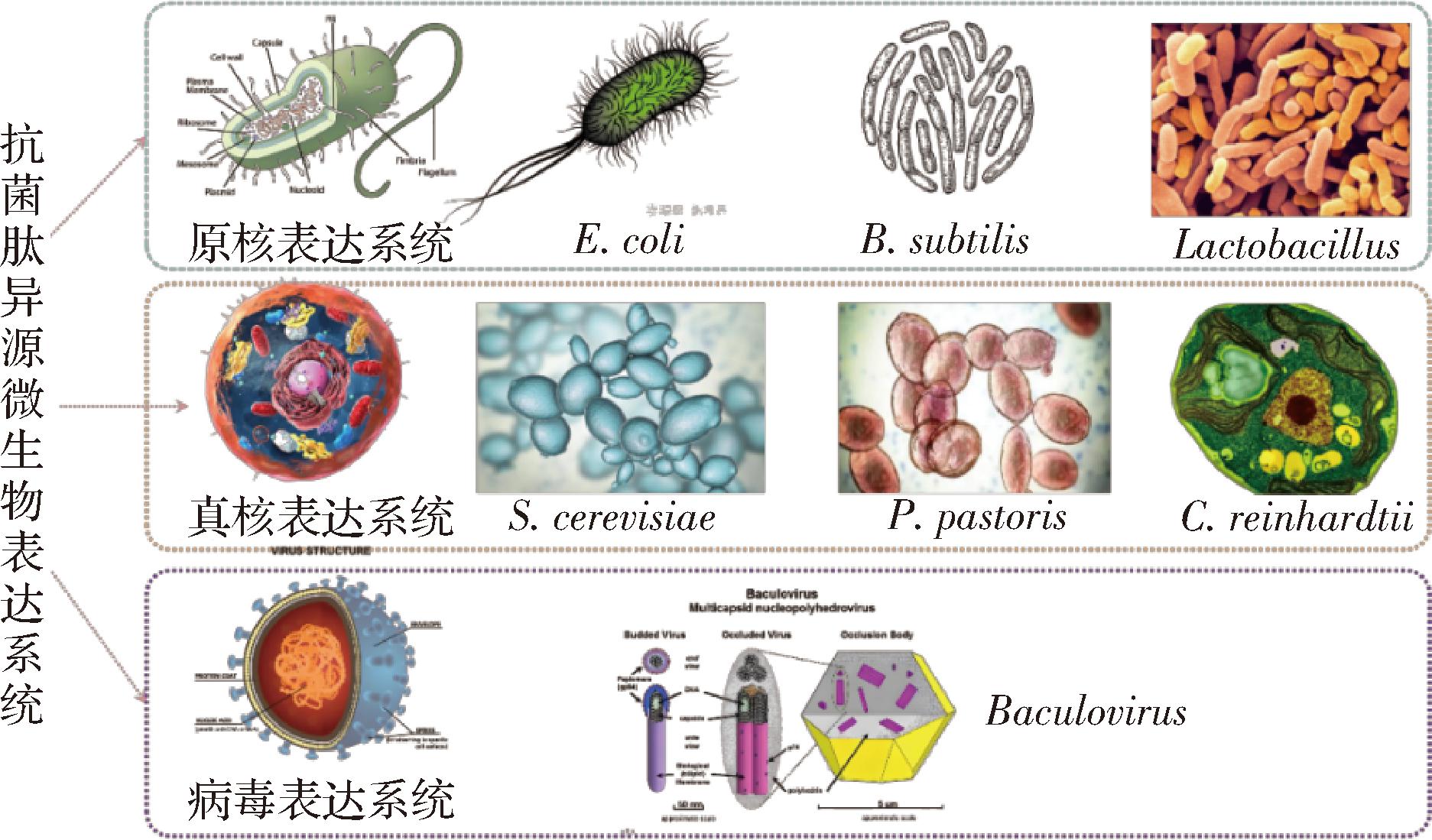 当前,抗菌肽微生物异源表达系统主要包括原核生物、真核生物和杆状病毒三类表达系统。原核生物表达系统主要包括大肠杆菌(Escherichia coli)表达系统、枯草芽孢杆菌(Bacillus subtilis)表达系统和乳酸杆菌(Lactobacillus)系统,真核表达系统主要包括毕氏酵母(Pichia pastoris)表达系统、酿酒酵母(Saccharomyces cerevisiae)表达系统和微藻表达系统,而病毒表达系统主要是杆状病毒表达系统。抗菌肽异源表达以原核与真核异源表达系统为主要表达体系,其中,细菌与酵母是抗菌肽最主要的宿主,占抗菌肽异源表达系统的97.4%[2],抗菌肽微生物异源表达系统如图1所示。