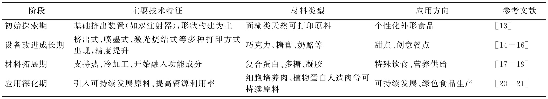 在食品3D打印技术的早期探索中,LIPTON等[13]利用配备双注射器的 Fab@Home Model 2 系统,成功打印出一款结构复杂且富有美感的饼干,标志着该技术在食品加工领域的首次应用。该饼干的外层由优化配比的面糊构建而成,原料包括黄油、糖粉、蛋黄、面粉、香精与食用色素,形成质地细腻、层次丰富的口感体验;内层则使用添加可可粉的面糊打印,呈现出一个大写字母“C”的独特结构,不仅增强了产品的风味层次,也提升了视觉美感。这一研究验证了3D打印技术在实现食品复杂形状定制方面的可行性,为后续的个性化食品制造提供了技术参考。随着技术的逐步成熟,研究者开始关注打印设备的改进与控制精度的提升。挤出式、激光烧结式、喷墨式等食品打印方式逐渐出现在人们的视野中,这些机器支持巧克力、糖膏、奶酪等热敏或冷加工材料的打印,并实现了对打印速度、层厚、温度等参数的精细化调控。近年来,食品原料逐步拓展至复合蛋白、复合多糖、水凝胶等营养功能型材料。食品3D打印逐步从“制造形状”向“精准营养+结构功能”的方向拓展,各时期的技术特征如表1所示,其在个性化餐食、老年食品、运动营养、医疗营养、儿童教育食品等领域展现出广阔应用前景。