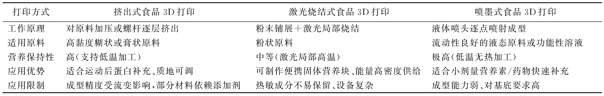 综上所述,不同食品3D打印方式在运动营养食品领域的适用特征与技术潜力各不相同,本文基于打印原理、材料适应性、成型精度与功能释放控制能力等方面,对挤出式、激光烧结式与喷墨式三类打印技术进行了对比分析(表2)。该比较可为后续在具体运动干预场景中的技术选择与工艺优化提供参考。
