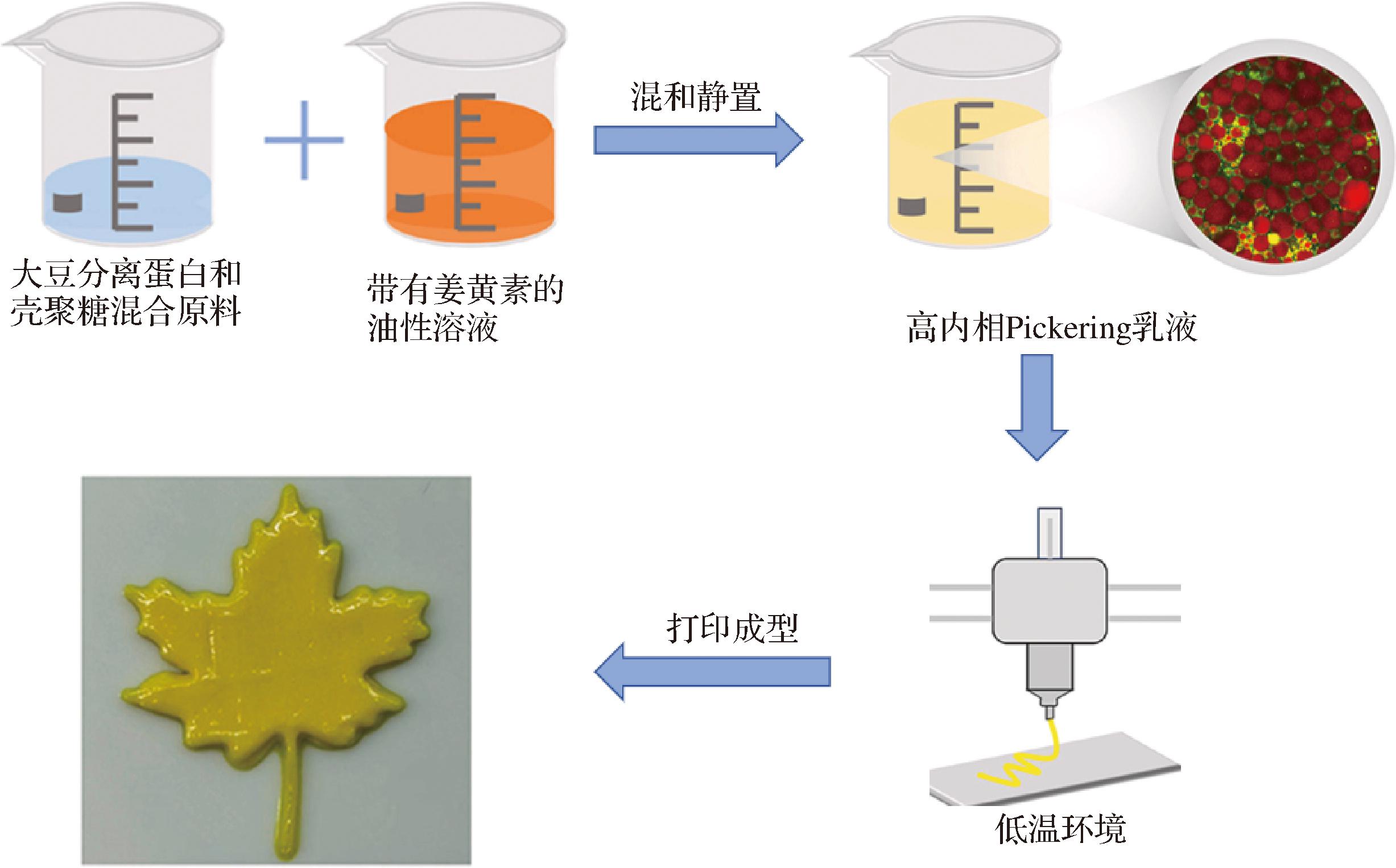 低温挤出食品3D打印是一种基于可控压缩或螺杆驱动的物料挤出机制,在低温环境下实现食品材料逐层沉积构建的增材制造技术[33]。在运动恢复时期,运动员通常需要补充乳清蛋白和维生素B12来促进肌肉恢复与能量代谢,而传统高温烘焙或煮制会对这2种营养成分的热敏成分造成破坏,低温挤出食品3D打印则能确保两者在食品中的稳定存在,增强营养利用效率。如WU等[34]利用低温沉积3D打印技术,以大豆分离蛋白和壳聚糖构建高内相Pickering乳液可食用油墨,在保持姜黄素等热敏性营养物质活性的同时,实现了高精度和高稳定性的打印产品,如图3所示。KLEINER等[35]利用螺旋藻在低温环境下进行打印,有效避免了高温对这些热敏性成分的破坏。研究结果表明,打印后的产品在保持螺旋藻特有的蓝绿色泽的同时,仍具备良好的抗氧化活性。该技术利用冷加工特性,有效避免了高温操作对原料中热敏活性物质的破坏,在实现精准成型的同时,保留食品原有的营养功能与感官品质。此外,低温环境有助于降低水分挥发速度,延缓氧化反应,适用于对保鲜性和营养敏感性要求较高的运动营养食品生产。综上,低温挤出食品3D打印在保持热敏性营养成分活性、提升产品营养功能保留方面展现出独特优势,适用于运动恢复期的功能食品构建。然而,目前相关研究多集中于单一配方构建与基础性能验证,尚缺乏对原料流变调控、多成分协同打印以及营养释放机制的系统分析,未来可进一步探索多组分食材在冷加工条件下的成型适配性及其对功能释放路径的耦合关系。