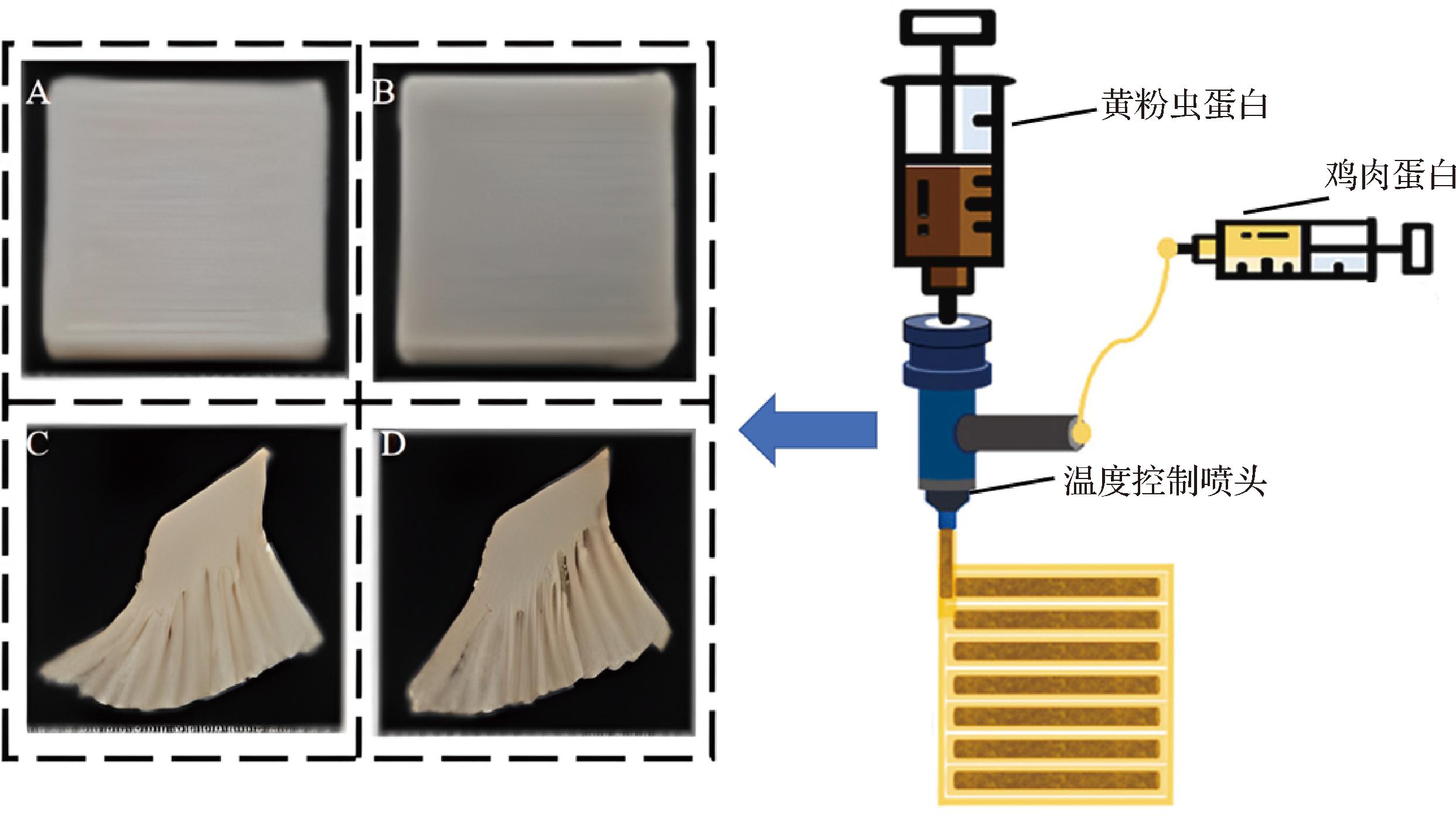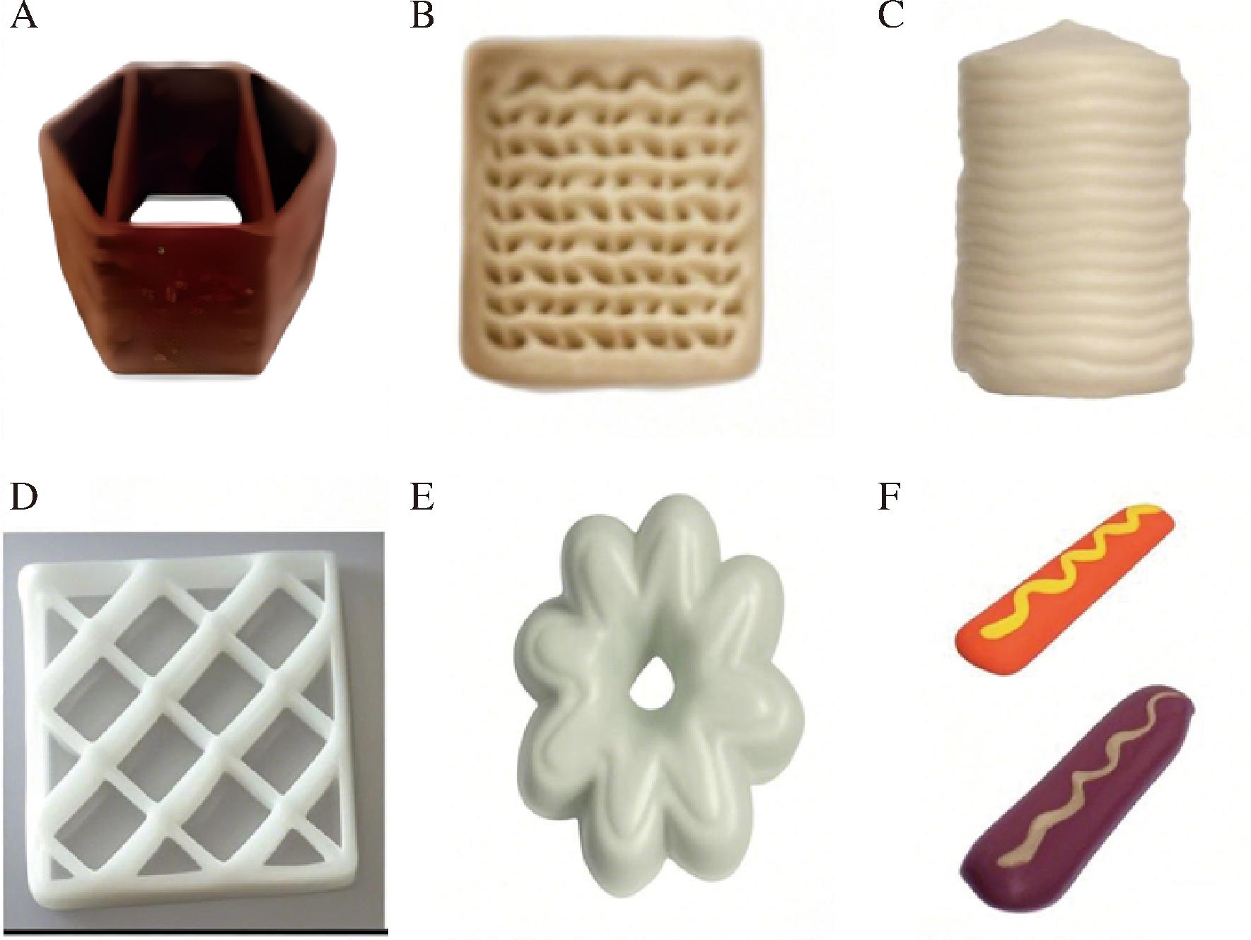 熔融挤出食品3D打印是一种基于热熔沉积原理的增材制造技术,其核心机制是将食品级热塑性材料在加热条件下熔融,并通过喷嘴按照预设路径逐层沉积成型,从而构建出具有特定三维结构和功能的食品产品[36]。该技术通过对原料进行加热处理并逐层沉积成型,赋予食品良好的结构成型性与质构可调性。通过调控打印配方中成分的比例及打印参数,可实现食品质构的精准设计与调节,满足不同运动人群的摄入需求。可针对高强度训练后的快速补能需求,打印出质地松软、易消化吸收的高能量食品;还可为咀嚼能力较弱或恢复期运动员定制柔软易咀嚼的营养食品,从而提升摄入的舒适性与依从性。如CHAO等[37]将鸡肉蛋白与黄粉虫蛋白混合用于3D打印,通过调控料筒和喷头的温度以改善原料的流变特性,成功打印出质地柔软、易于消化的功能性蛋白食品,产品如图4所示。如AGUNBIADE等[38]将巧克力作为外壳材料,糖果作为内核材料,通过调控巧克力熔融温度,使其在打印过程中充分覆盖糖果材料并迅速凝固。实现了结构清晰、粘合牢固的双层打印食品,提高了整体稳定性和感官层次,适合用于多层甜点类运动能量食品的定制。在运动营养食品领域,可借鉴该原理,通过熔融挤出技术打印营养胶囊,将熔融态的营养成分作为内核,外层包裹凝胶类材料形成胶囊外壳。通过调控打印层厚与填充结构,不仅可增强食品的结构稳定性,还能实现营养成分的缓释释放,满足耐力训练过程中对持续能量供给的需求。该技术通过加热热塑性原料并逐层沉积,实现食品结构与质构的精准调控,满足更多运动人群的营养需求。熔融挤出食品3D打印在结构稳定性构建、多层次质构调节与功能性营养封装方面展现出良好适配性,尤其适用于能量补充型与质构敏感型运动营养食品的定制。然而,该类技术普遍依赖热塑性原料,加热过程可能对热敏性活性成分造成破坏,目前仍缺乏在功能活性保留、内核释放动力学及多成分耦合设计方面的深入研究,后续可重点探索复合结构封装策略与控温打印参数对营养释放行为的调控机制。