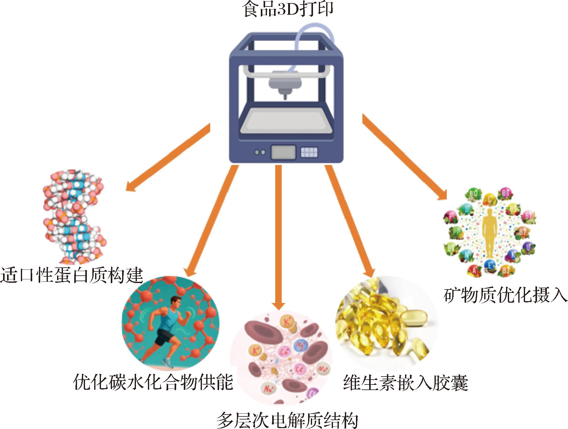 3D打印是一种以数字模型为基础,通过逐层堆叠材料来构建实体的先进制造技术[3]。不仅可以快速原型开发和小批量定制生产,还打通了从设计到制造的全过程,突破了传统加工方式的局限。近年来,3D打印技术的可打印材料也由最初的聚合物[4]扩展到金属[5]、陶瓷[6]、砂类[7]和生物组织[8]等多种类型,广泛应用于航空航天[9]、医疗健康[10]、汽车制造[11]等领域,展现出强大的发展潜力。在食品制造领域,3D打印不仅改变了食品制造方式,更为运动营养食品带来巨大的突破口。相较于传统食品制造工艺在定制化和精准营养补给方面的局限,3D打印可通过可控原料配比、结构层级设计及功能因子精准定位,实现“营养成分-打印结构-摄入效果”的有机联动。当前运动营养食品普遍面临配方同质化、功能释放时效差、个体适配度低等问题,随着3D打印技术的引入,有望打通从运动状态识别、营养干预方案生成到即时食品制造的个性化闭环路径,精准适配不同运动阶段(如训练期、赛前恢复期、赛后补偿期)对蛋白质、碳水、电解质、微量活性因子的差异化需求。