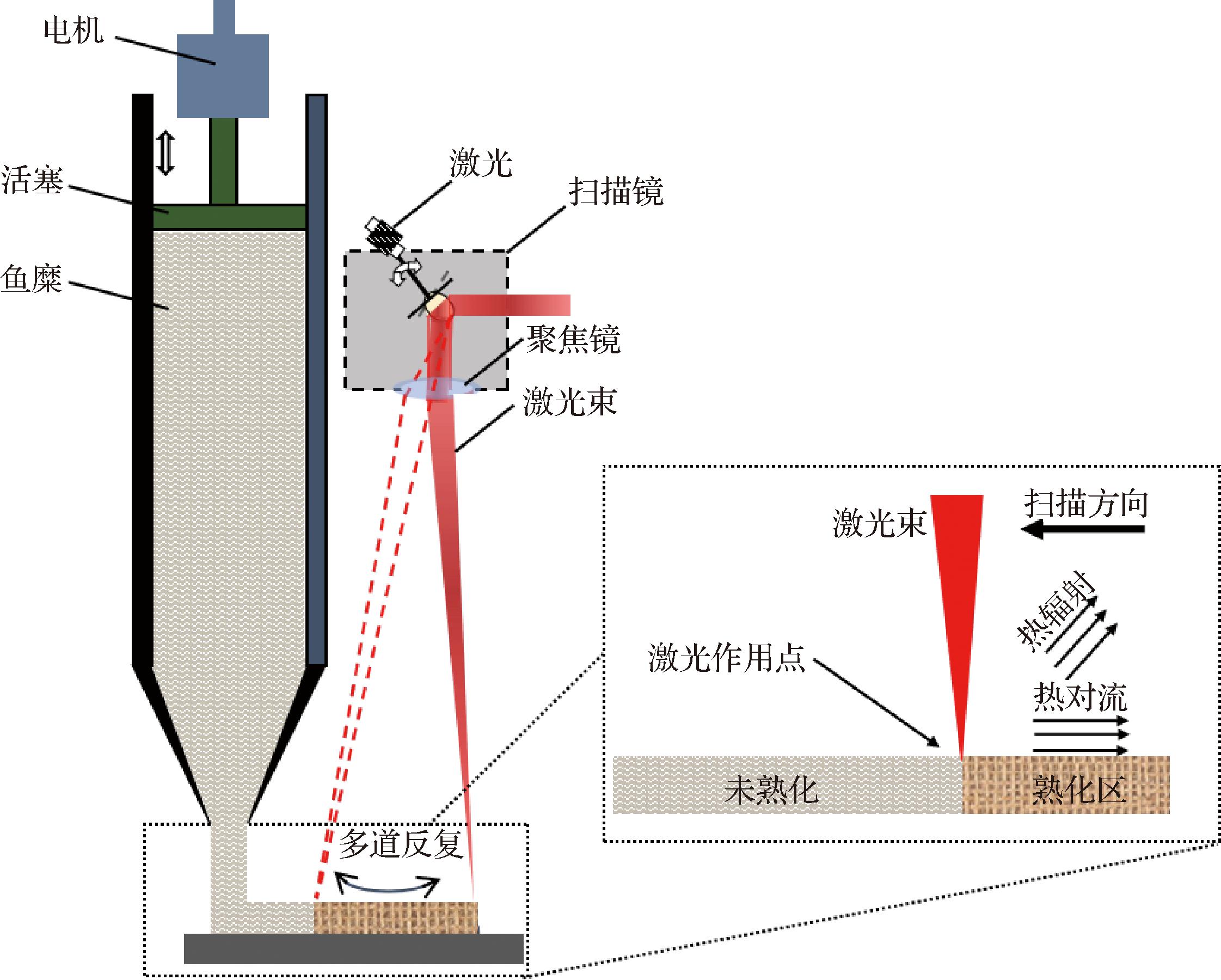 在运动员比赛或训练期间,时间通常较为紧迫。通过调整原料比例以改善打印产品的稳定性往往会消耗较多时间。此外,尽管添加食品添加剂可以有效提高产品的稳定性,但可能会在比赛前的体检过程中引发不必要的麻烦。因此,需开发更为高效且不依赖于添加剂的技术,以保持打印产品的稳定性,同时避免影响运动员的健康状况和体检结果。激光作为一种高精度的热源,能够在短时间内提供集中的能量,从而实现对材料的局部加热和加工。在食品3D打印中,激光技术可用于精确控制材料的热处理过程。如TONG等[53]研究团队采用功率为50 W的CO2激光器对鱼糜进行局部热固化,成功实现了鱼糜蛋白的局部热凝胶化。通过控制蛋白质在打印过程中的热变性与凝固,研究有效解决了肉类蛋白食品在3D打印过程中出现的结构不稳定问题,从而增强了打印产品的机械强度和形态稳定性,实验原理图如图7所示。此外,静电纺丝通过在高电压作用下将聚合物溶液或熔体拉伸成纳米级纤维,这些纤维具有优异的机械性能。将这些纳米纤维喷射在产品外表面,提高食品在3D打印过程中的稳定性。如GHORANI等[54]引入了通过静电纺丝技术制备的纳米材料,以提升食品原料的强度和弹性,从而打印出结构稳定的产品。为满足运动员在赛前训练或高强度负荷期间对食品打印快速性与无添加性的需求,激光热处理与静电纺丝等非接触增强手段为提升产品结构稳定性提供了有效路径。两者均可在不依赖传统食品添加剂的前提下,通过物理强化方式改善蛋白质网络结构与表面成膜性能,增强成型精度与机械强度。