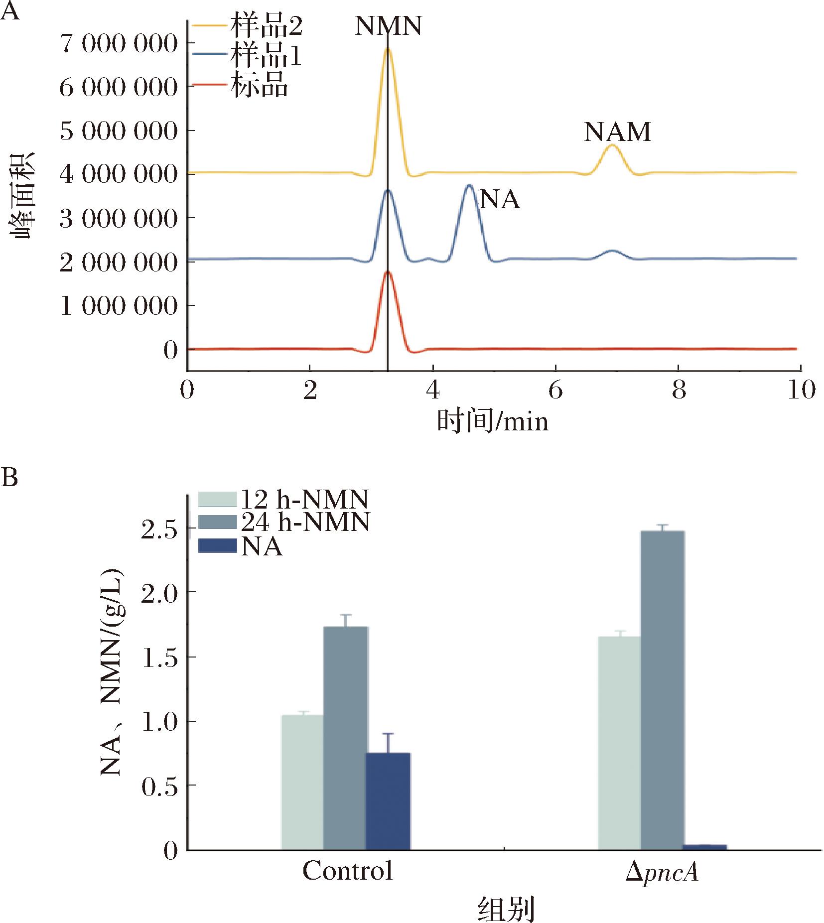 A-pncA成功敲除的HPLC验证(样品1:未ΔpncA,样品2:ΔpncA);B-未敲除与敲除pncA菌株的摇瓶发酵