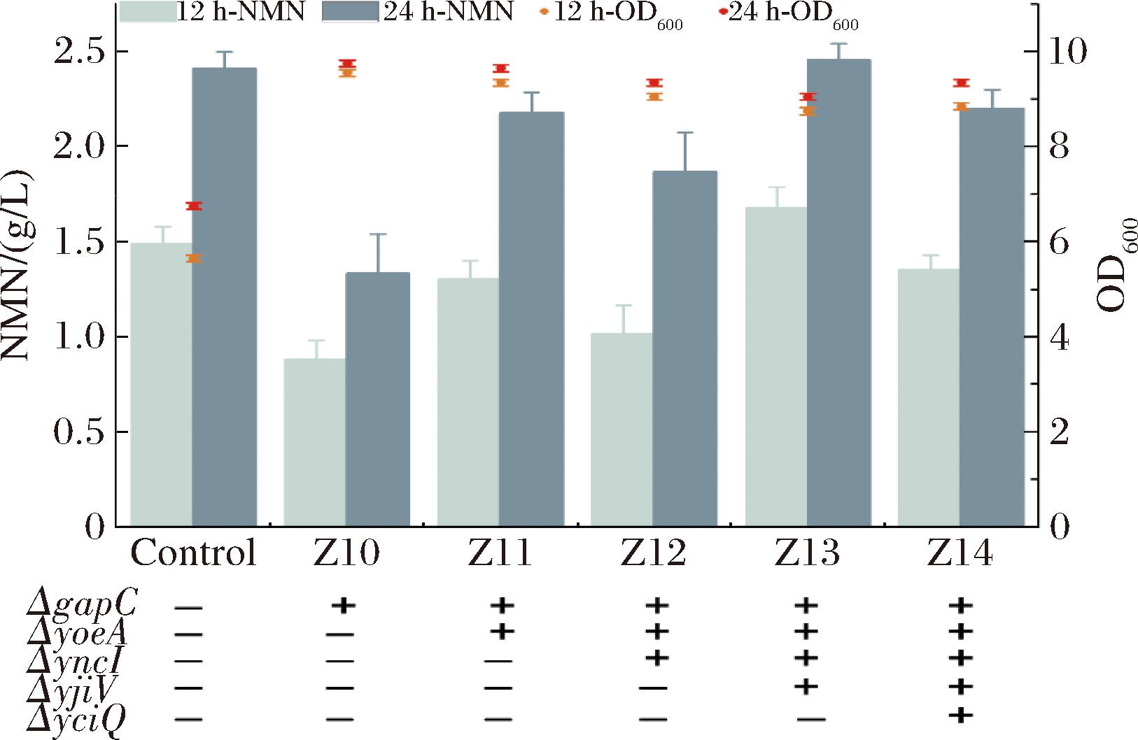 摇瓶发酵实验表明,基因组整合菌株的生长性能显著改善。在添加1 g/L NAM的条件下,质粒菌株的OD600最大值为6.7,而基因组菌株为8.5~10.1。值得注意的是,菌株Z13的生长情况最优,发酵24 h后NMN积累量达到2.51 g/L,与对照菌株提升较少(图2)。而菌株Z14 NMN产量降低原因可能为过度表达导致的膜电位失衡。证实基因组多拷贝策略可在降低代谢负荷的同时维持关键转运蛋白的功能表达。