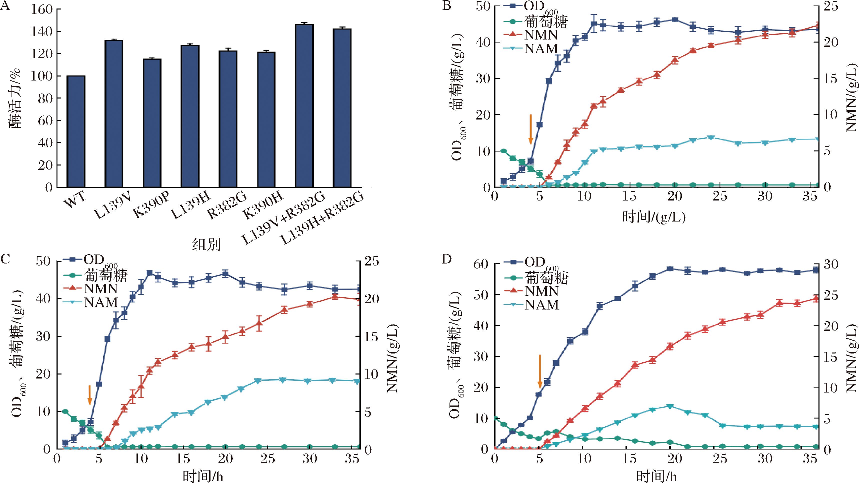 对所得阳性突变体进行酶活性验证,其中突变体VpNadVL139V+R382G、VpNadVL139H+R382G有着较高活性,相比于野生型VpNadV分别提高46.1%和41.2%(图7-A)。首先为确定5 L发酵罐培养的最适底盘菌株,分别观察底盘菌株Z09与Z13在5 L发酵罐中的生长与NMN合成情况。发现菌株Z13虽然在孔板、摇瓶等小型生物反应器中的OD600值得到了提高,但是在放大培养过程当中,可能由于多条假基因位点的敲除导致发酵过程中其他有害副产物的积累,从而导致了其在发酵罐中的生长情况较差,NMN的合成情况也就较差。因此,为观察突变体在5 L发酵罐放大培养时对NMN合成的影响,选择底盘菌株Z09作为底盘菌株进行发酵验证。分别构建重组菌株ZY150和ZY151,在发酵过程中将DO水平控制在30%,OD600值为10时加入IPTG诱导,同时以适当的流速流加底物NAM,发酵36 h后NMN的产量分别为22.46 g/L和20.23 g/L(图7-B、图7-C),所以选择重组菌株ZY150进行发酵优化。为了进一步提高发酵过程的生物量,尝试在OD600值达到20时再加入IPTG诱导蛋白表达,同时控制底物NAM的流速(前期高流速后期低流速),发酵36 h后NMN产量达到24.4 g/L(图7-D)。结果表明,适当提高发酵过程诱导时的OD600值提高菌体量有利于NMN的积累。