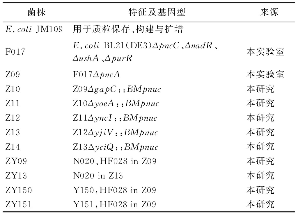 菌株特征及基因型来源E.coli JM109用于质粒保存、构建与扩增F017E.coli BL21(DE3)ΔpncC、ΔnadR、ΔushA、ΔpurR本实验室Z09F017ΔpncA本实验室Z10Z09ΔgapC::BMpnuc本研究Z11Z10ΔyoeA::BMpnuc本研究Z12Z11ΔyncI::BMpnuc本研究Z13Z12ΔyjiV::BMpnuc本研究Z14Z13ΔyciQ::BMpnuc本研究ZY09N020、HF028 in Z09本研究ZY13N020 in Z13本研究ZY150Y150,HF028 in Z09本研究ZY151Y151,HF028 in Z09本研究