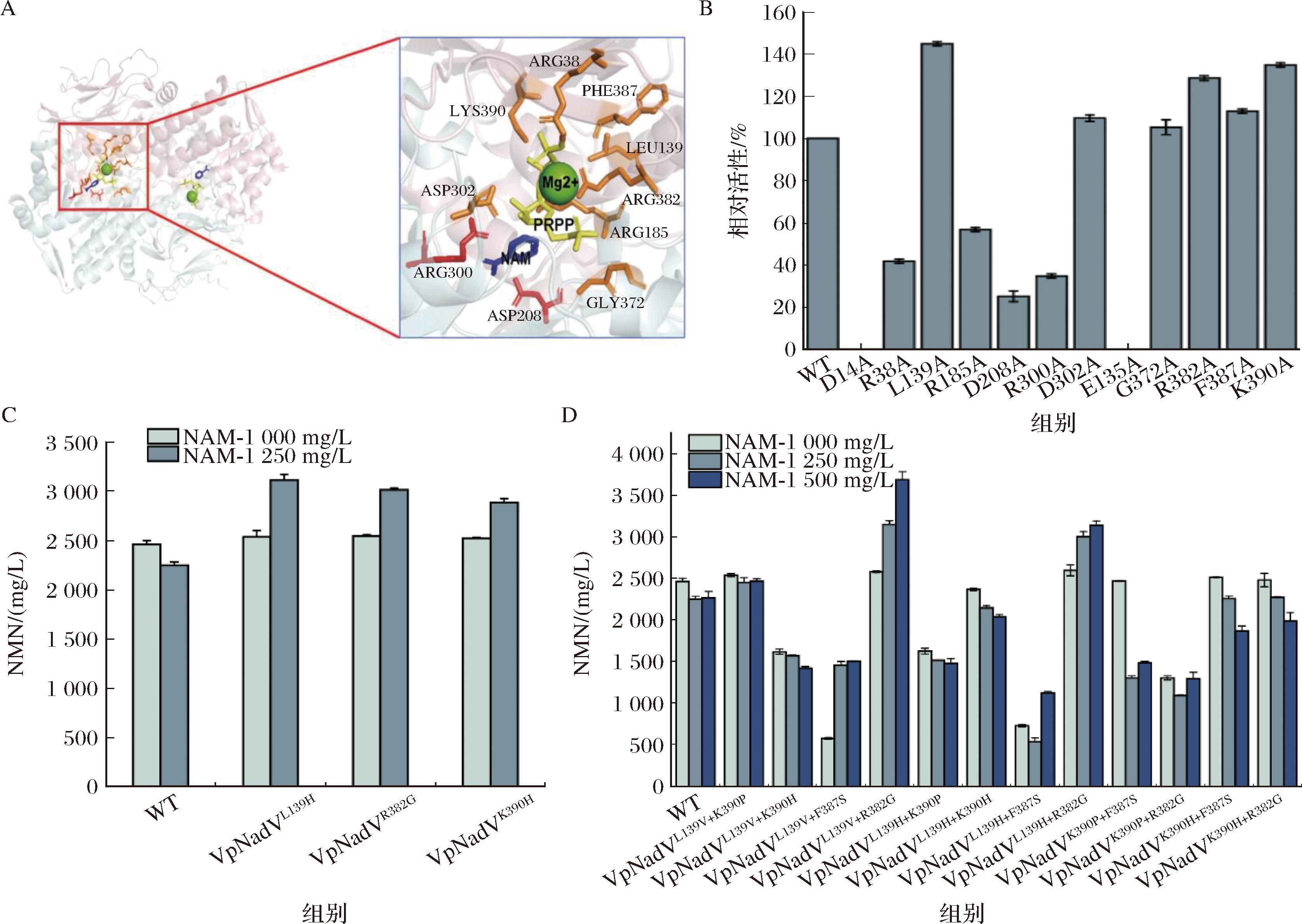 NAMPT催化过程是一个取代反应[21]。通过模型分析发现,NAM作为较小分子率先进入底物口袋,而PRPP在ATP的激活下与Mg2+形成配位键之后,进入底物口袋作用于NAM吡啶环上的氮原子,导致NMN的合成。通过对活性中心区域氨基酸残基进行丙氨酸扫描后,确定了10个关键氨基酸残基(图6-B)。以这些位点为基础,建立饱和突变文库,结合所建立的高通量筛选系统进行筛选。摇瓶复筛后,得到了另外的3株阳性突变体VpNadVL139H、VpNadVR382G、VpNadVK390H,其中突变体VpNadVL139H在添加1.25 g/L NAM时,NMN的最高产量为3.13 g/L,相比于对照组提升39.4%,底物转化率为92.8%(图6-C)。对突变体VpNadVF387S、VpNadVL139V、VpNadVK390P、VpNadVL139H、VpNadVR382G、VpNadVK380H进行叠加突变,摇瓶发酵结果分析,突变体VpNadVL139V+R382G在添加1.5 g/L NAM时,NMN的最高产量为3.68 g/L,相比于对照组提升63.18%,底物转化率为91%(图6-D)。
