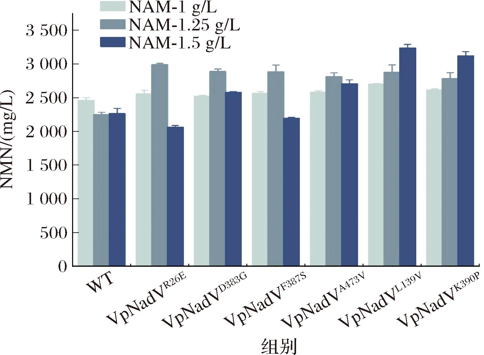 本研究基于定向进化策略,采用易错PCR技术成功构建了包含13 000个随机突变体的VpNadV酶突变文库。通过前期构建的高通量筛选平台,实现了对大规模突变体的快速筛选。在初筛阶段发现95个突变体表现出显著增强的催化活性,其荧光强度较野生型提高30%以上。经测序确定突变位点后,通过摇瓶发酵复筛后最终获得6个能够使NMN合成量显著提升的阳性突变体(VpNadVR26E、VpNadVL139V、VpNadVD383G、VpNadVF387S、VpNadVK390P、VpNadVA473V)。其中,突变体VpNadVR26E在添加1.25 g/LNAM时,NMN的最高产量为2.98 g/L,相比对照组提升32.9%,底物转化率为88.5%;突变体VpNadVL139V在添加1.5 g/LNAM时,NMN的最高产量3.24 g/L,相比对照组提升43.1%,底物转化率为79.8 %(图5)。
