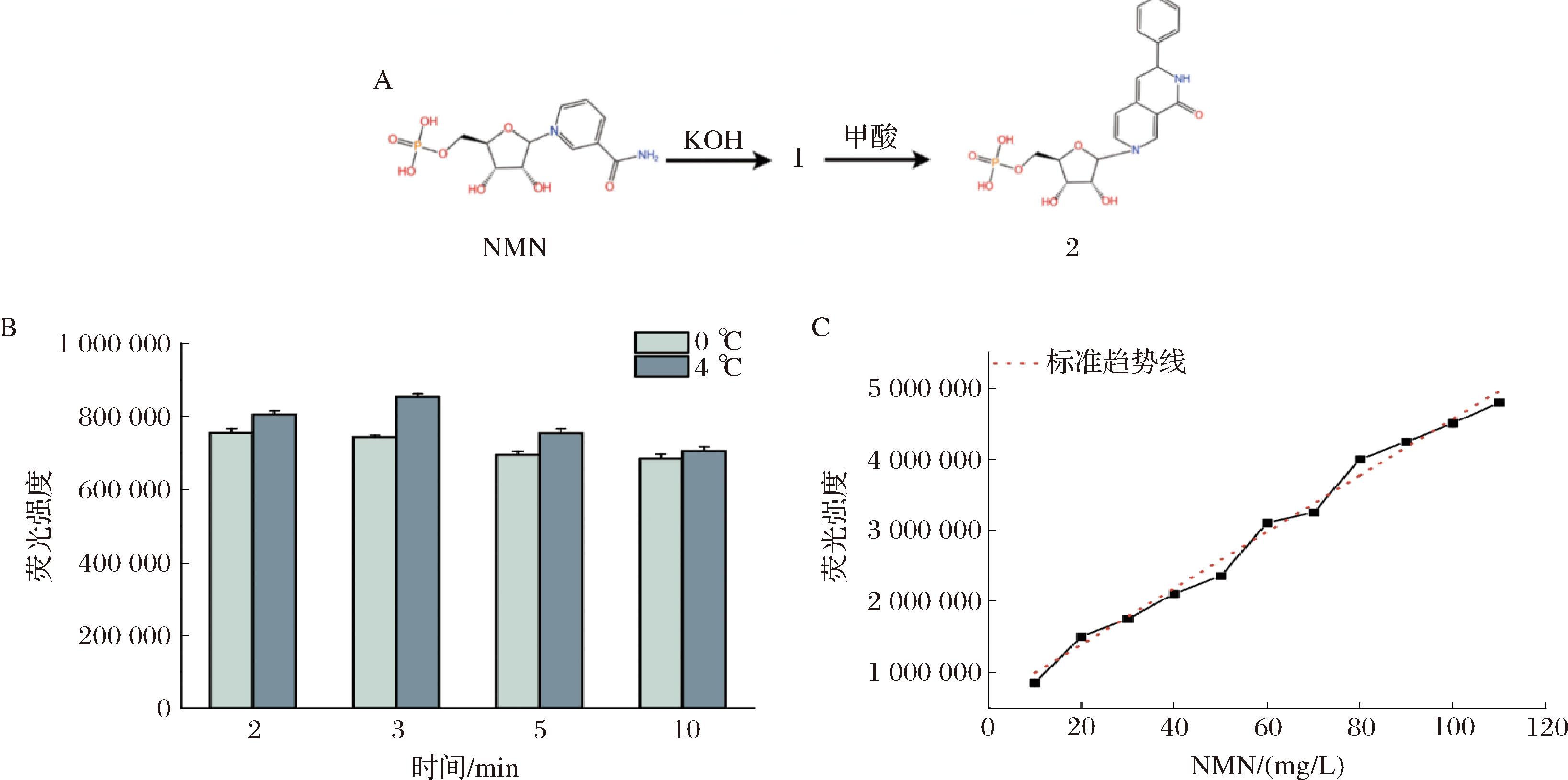 该荧光反应体系包含2个步骤:a)NMN与KOH反应生成荧光物质1;b)荧光物质1与甲酸反应生成荧光物质2(图4-A)。针对步骤1,优化了0 ℃与4 ℃下的不同反应时长,结果显示,在4 ℃下反应所产生的荧光强度比0 ℃下更强。而且在4 ℃条件下,当反应延长至3 min时,荧光强度达到最高,为0 ℃条件下的1.15倍,此后继续延长反应时间,荧光强度不再受到影响。因此,确定了步骤1的最佳反应条件为4 ℃、反应时长3 min(图4-B)。基于步骤1的最优条件,又优化了步骤2,研究显示该反应在1 min时可完成约90%,至10 min时完全反应,此后荧光强度仍在一段时间保持稳定,常将10 min作为该步骤的最佳反应时间。然而,对于发酵上清液,相较于纯酶体系,其中存在更多杂蛋白或杂质。将该步骤的反应时间设定为20 min,即荧光强度达到完全稳定。随后,通过配制不同浓度梯度的NMN标准液,由此获得了质量浓度为10 ~110 mg/L且相关系数为0.97的校准曲线(图4-C)。为使发酵液中的NMN合成量处于线性范围,还确定了诱导后的最佳发酵时间为10 h。