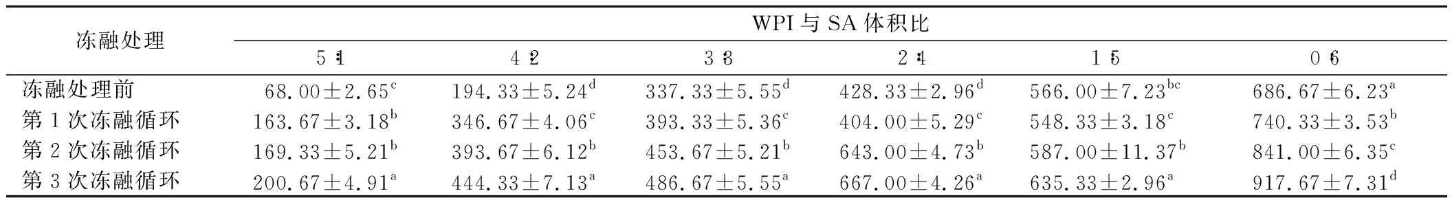 冻融处理WPI与SA体积比5∶14∶23∶32∶41∶50∶6冻融处理前68.00±2.65c194.33±5.24d337.33±5.55d428.33±2.96d566.00±7.23bc686.67±6.23a第1次冻融循环163.67±3.18b346.67±4.06c393.33±5.36c404.00±5.29c548.33±3.18c740.33±3.53b第2次冻融循环169.33±5.21b393.67±6.12b453.67±5.21b643.00±4.73b587.00±11.37b841.00±6.35c第3次冻融循环200.67±4.91a444.33±7.13a486.67±5.55a667.00±4.26a635.33±2.96a917.67±7.31d