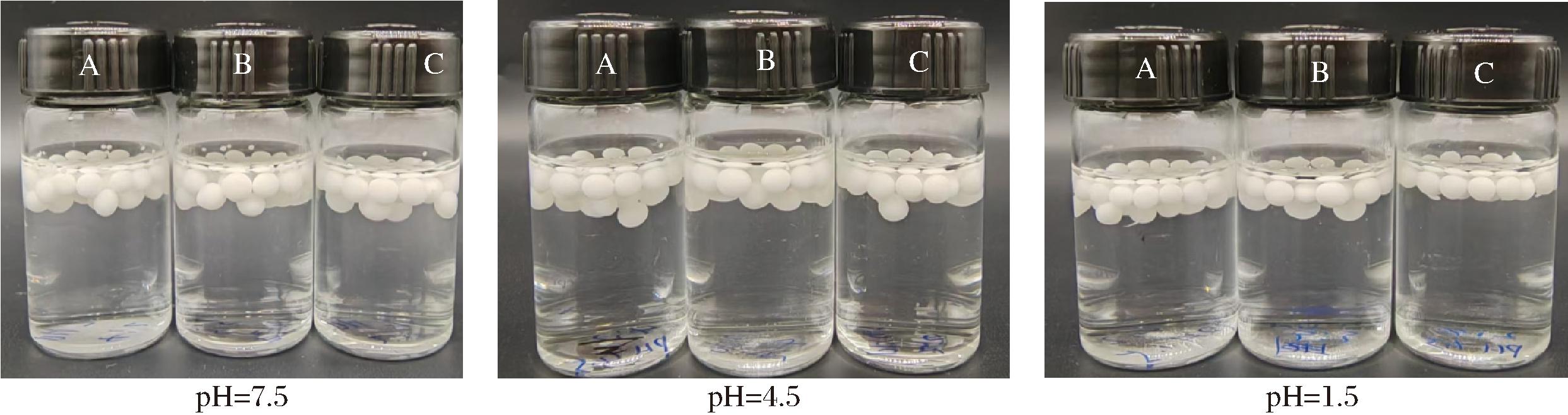 取WPI与SA体积比为4∶2、3∶3、2∶4的现制乳液凝胶球(每种配料比取20个)置于小玻璃瓶中,向其中分别加入10 mL不同 pH(1.5、4.5和7.5)的水溶液,涡旋混合1 min,于室温下贮藏7 d后观察乳液凝胶表观状态并拍照记录。