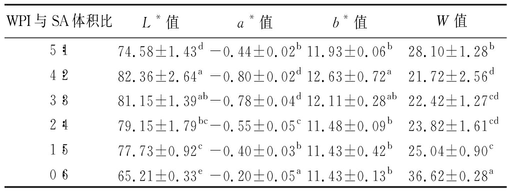 WPI与SA体积比L*值a*值b*值W值5∶174.58±1.43d-0.44±0.02b11.93±0.06b28.10±1.28b4∶282.36±2.64a-0.80±0.02d12.63±0.72a21.72±2.56d3∶381.15±1.39ab-0.78±0.04d12.11±0.28ab22.42±1.27cd2∶479.15±1.79bc-0.55±0.05c11.48±0.09b23.82±1.61cd1∶577.73±0.92c-0.40±0.03b11.43±0.42b25.04±0.90c0∶665.21±0.33e-0.20±0.05a11.43±0.13b36.62±0.28a