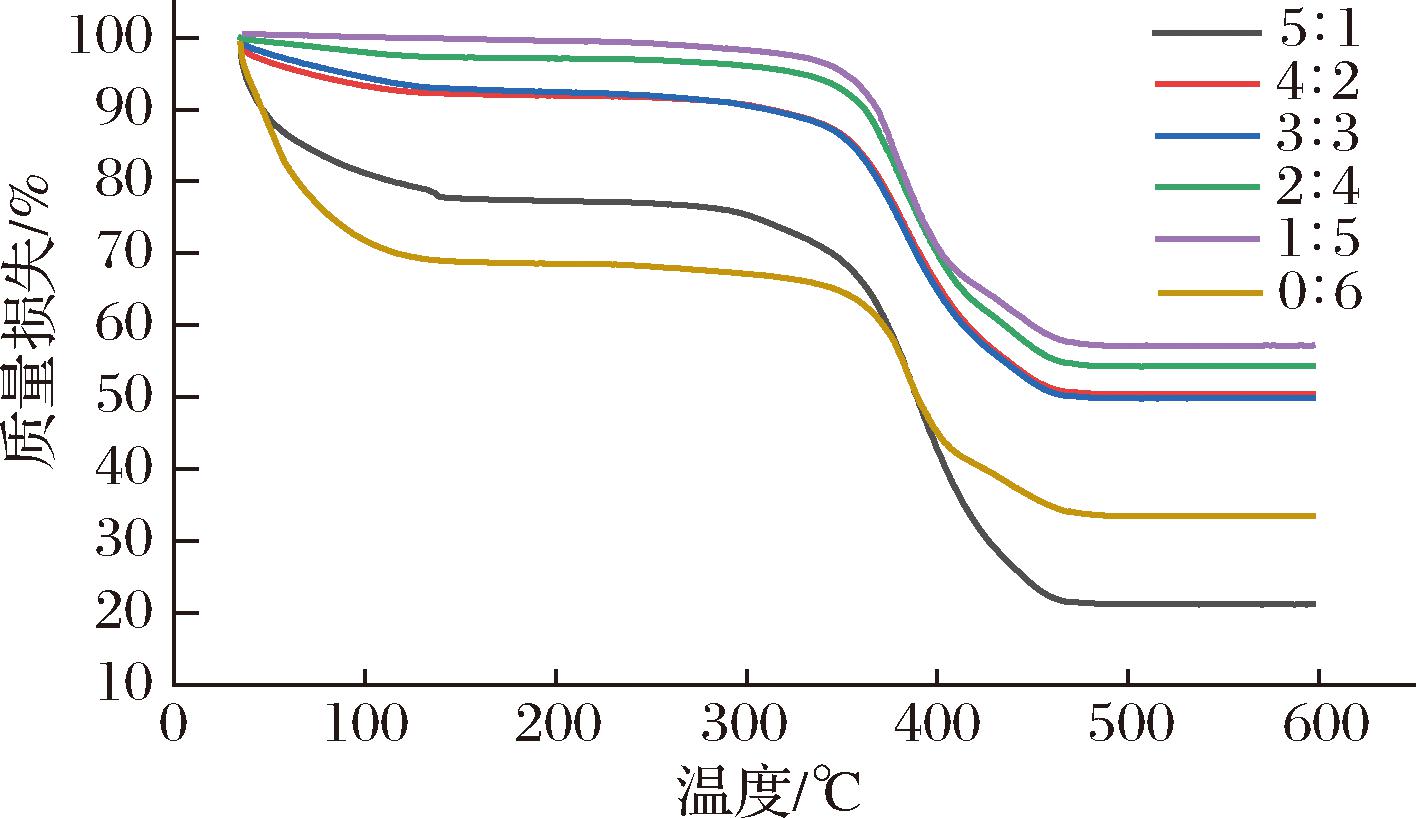热重分析是研究物质的质量与温度之间的关系的技术,可以用于考察物质热力学性能。不同WPI-SA乳液凝胶球热重变化趋势见图9。WPI与SA体积比为4∶2、3∶3、2∶4的乳液凝胶球热重曲线走势相似。在 300~500 ℃,WPI-SA乳液凝胶球的质量百分比减少明显加快, 而在500~600 ℃则趋势减缓。在300~500 ℃对应于乳液凝胶球中存在组分的化学分解。