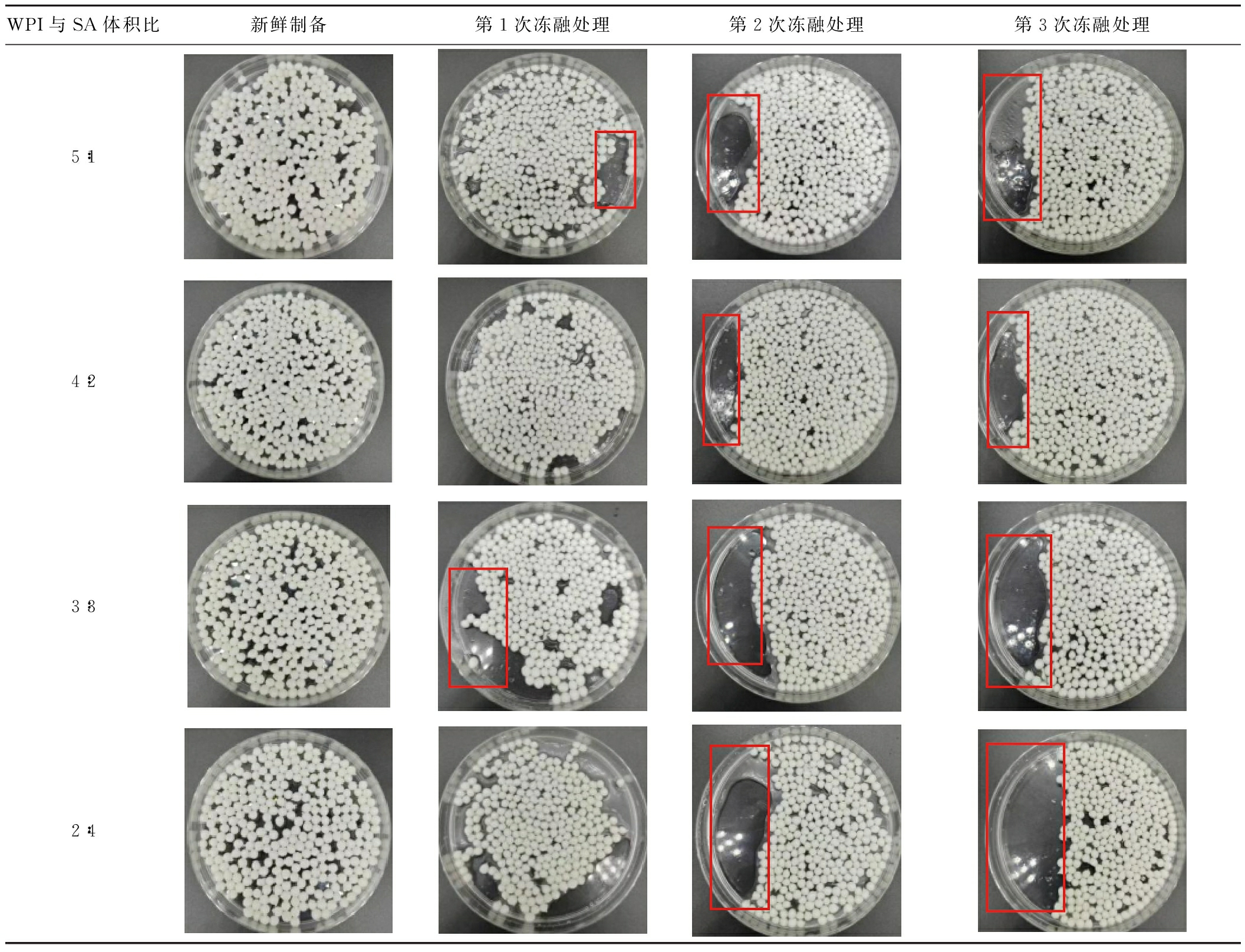 表4 WPI-SA乳液凝胶球冻融后的外观图