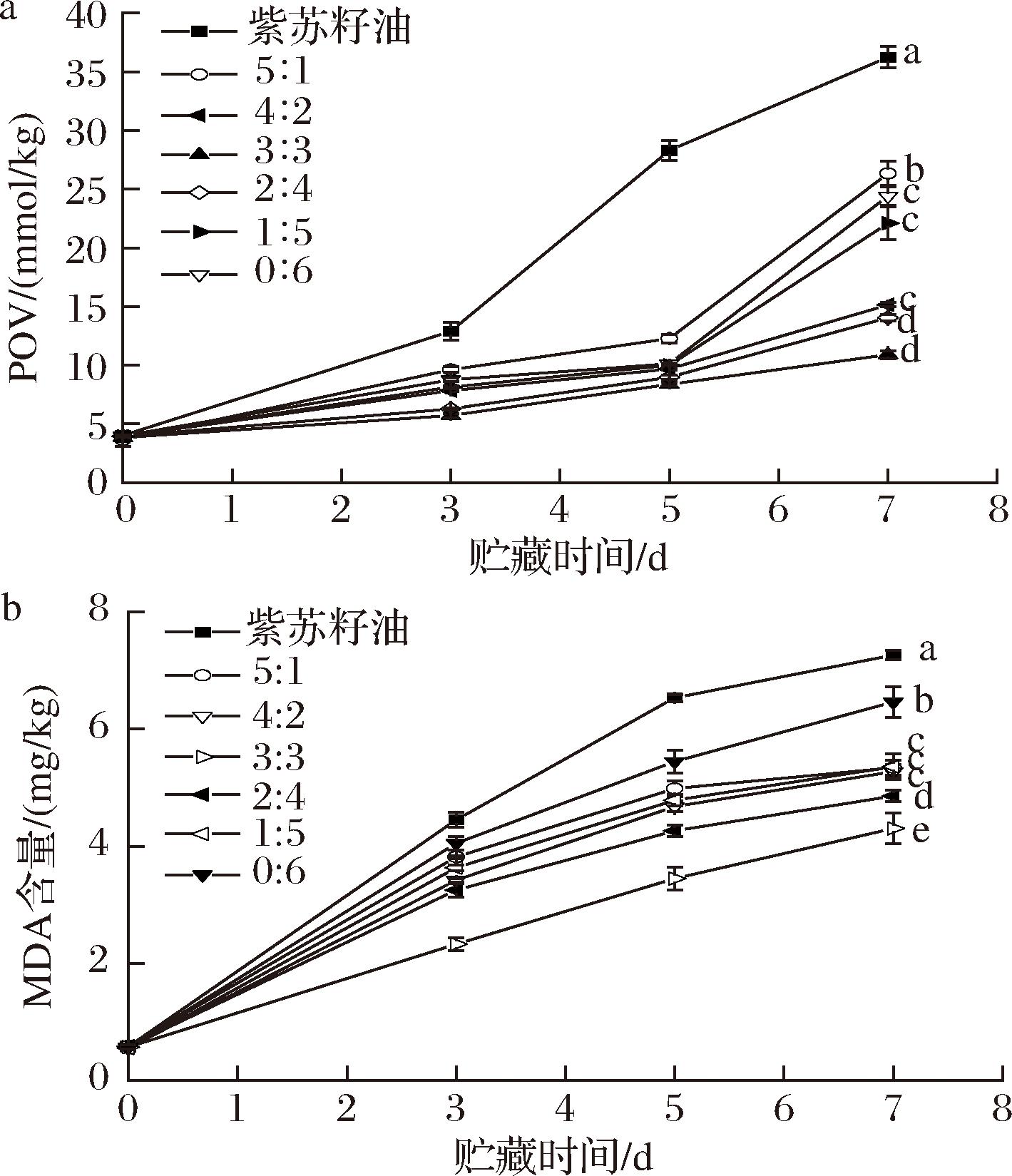 贮藏过程中初级氧化产物和次级氧化产物的变化可反映WPI-SA乳液凝胶球中脂质的氧化速率。POV 用于测量初级氧化产物(氢过氧化物)的形成,而 TBARS 用于测量次级分解产物[丙二醛(malondialdehyde acid,MDA)]的形成。以紫苏籽油组作为对照,乳液凝胶贮藏稳定性结果见图10。随着贮藏时间的延长,所有样品中的POV和MDA明显增加。与紫苏籽油相比,WPI-SA乳液凝胶球均表现出明显的脂质氧化抑制作用。当WPI与SA体积比为1∶1时,脂质氧化速率最低,贮藏期间产生POV、MDA的速率最慢,乳液凝胶的抗氧化性最强。这是由于当WPI与SA体积比为1∶1时,所形成的乳液凝胶液滴尺寸更小、分布更加均匀,增强了凝胶网状结构,形成致密的界面层,可以阻碍油滴与连续相中促氧化剂如金属离子之间的接触[43],并且阻止氧自由基的传递和转移,进而明显减缓了乳液凝胶贮藏过程中初级氧化产物、次级氧化产物的产生速率。