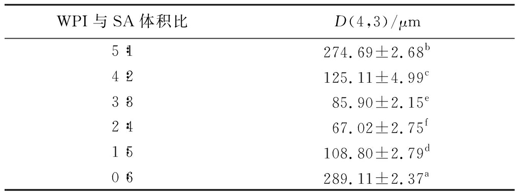 WPI与SA体积比D(4,3)/μm5∶1274.69±2.68b4∶2125.11±4.99c3∶385.90±2.15e2∶467.02±2.75f1∶5108.80±2.79d0∶6289.11±2.37a