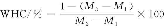 参照ZHANG等[30]的方法,取WPI-SA乳液凝胶球(约5 g)样品置于离心管中,离心管质量为M1(g),称量WPI-SA乳液凝胶球与离心管总质量为M2(g),随后,在8 000 r/min离心10 min后将析出的水分倒出,用滤纸擦干离心后WPI-SA乳液凝胶球表面的水分,称量离心后WPI-SA乳液凝胶球质量记为 M3(g),重复操作3次,取平均值。持水性(water-holding capacity,WHC)计算如公式(2)所示: