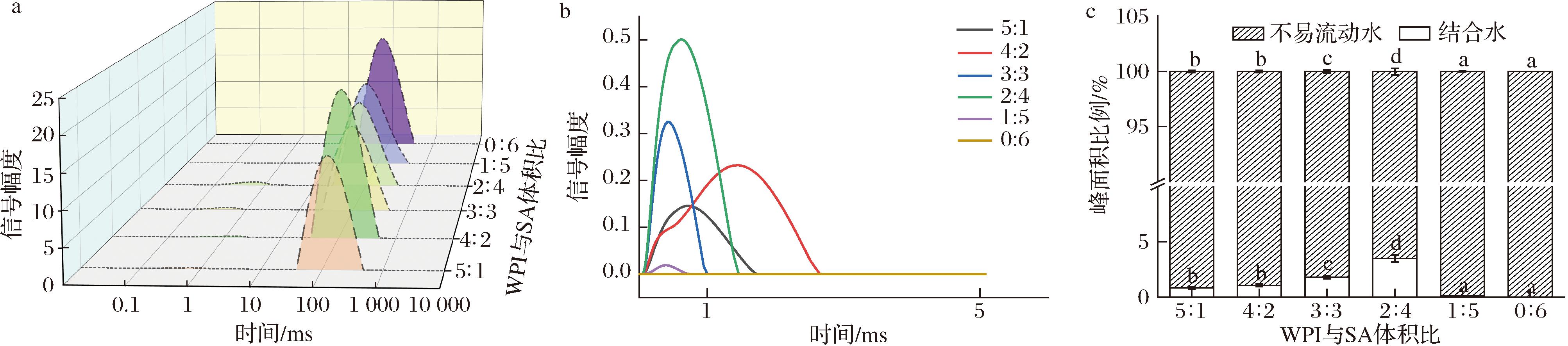 LF-NMR通常用于测定凝胶系统中水分子的迁移率和比例,各组分的T2可以用来确定凝胶对水的结合能力。凝胶系统中的水根据T2范围可分为3种状态[39]:结合水(T21:0~10 ms)、不易流动水(T22:10~100 ms)和自由水(T23:100~1 000 ms)。T2缩短说明水分流动性减弱,而T2延长反映水分流动性的增强。由图6-a和6-c可以看出所有配料比的WPI-SA乳液凝胶球中主要由不易流动水构成,含有微量的结合水,几乎没有自由水,这意味着水的流动性减弱,说明该凝胶体系可以有效固定水分,这与WHC的结论一致。