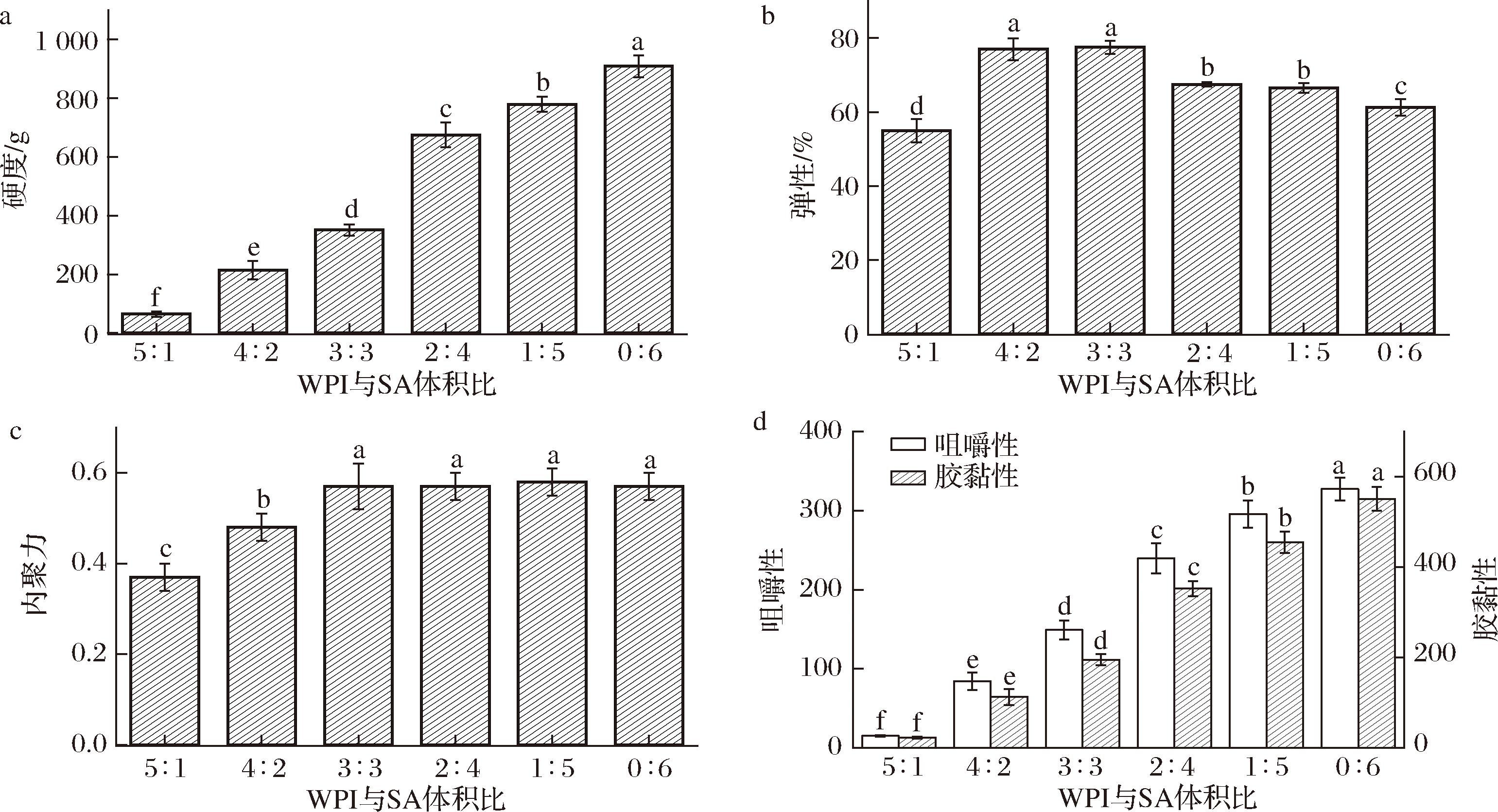 不同SA含量的WPI-SA乳液凝胶球在质构特性上存在显著差异。为探究该体系乳液凝胶球是否符合感官需求,测定了WPI-SA乳液凝胶球的质构。硬度被认为是达到一定变形所需的力,它可以作为食品硬度的量度。如图4所示,随着SA含量的增加,WPI-SA乳液凝胶球的硬度不断增强,单独由SA构成的乳液凝胶球硬度最高。所以WPI-SA乳液凝胶球主要由SA与Ca2+形成的“蛋壳”网络状结构所构成[23]。SA含量越高,形成的网络结构越坚固,越不易发生变形。但是添加过多的SA导致WPI-SA乳液凝胶球的弹性下降,这表明添加适量的WPI可以改善WPI-SA乳液凝胶球的弹性。凝胶珠应具有较高的硬度和弹性,以便这些含有活性化合物的胶囊可以应用于功能性食品中[35]。综合分析,WPI和SA体积比为3∶3、2∶4和1∶5的WPI-SA乳液凝胶球具有较高的弹性和硬度,符合功能性食品应用条件。