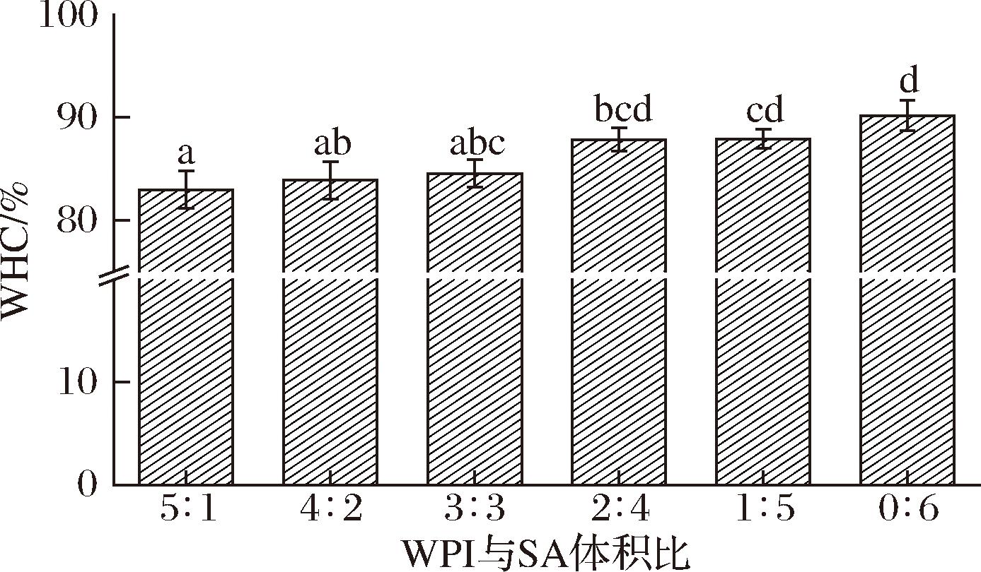 持水性大小可以反映WPI-SA乳液凝胶球的稳定性和强度[38]。由图5可知,所有的WPI-SA乳液凝胶球WHC均超过80%,说明该体系的WPI-SA乳液凝胶球网络结构可以有效封锁内部水分。并且SA的占比越高,WPI-SA乳液凝胶球WHC越强。仅由SA构成的凝胶球最高。这表明SA浓度越高的WPI-SA乳液凝胶球对离心力的抵抗力越强,可能是由于随着SA浓度的增加,SA分子与Ca2+交联度越高,形成的“蛋壳”状网络结构越坚固[23],从而稳定内部空间结构,提高了WHC。