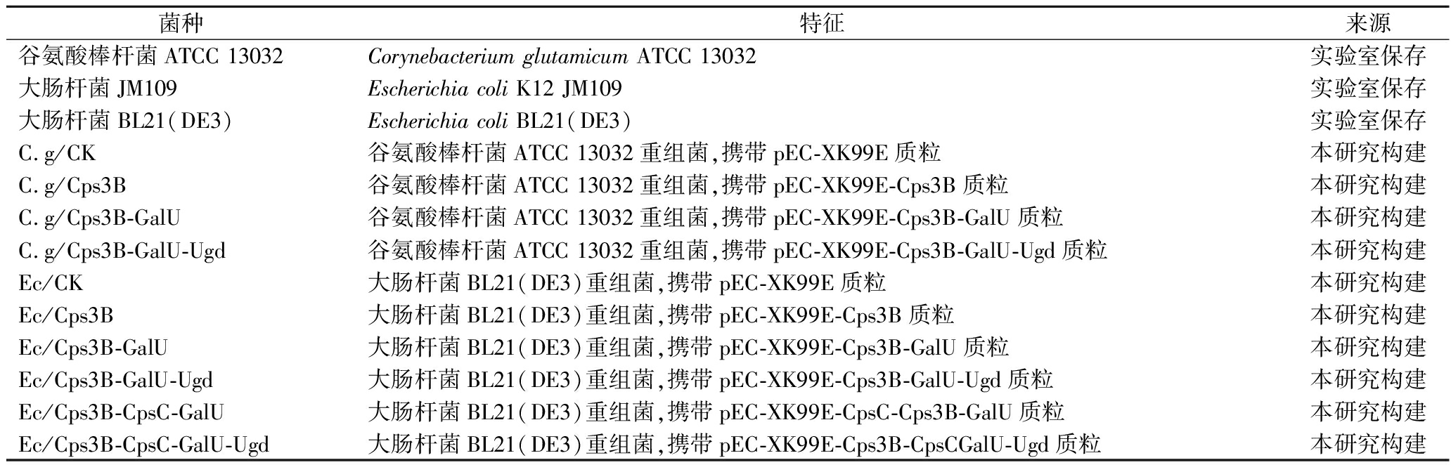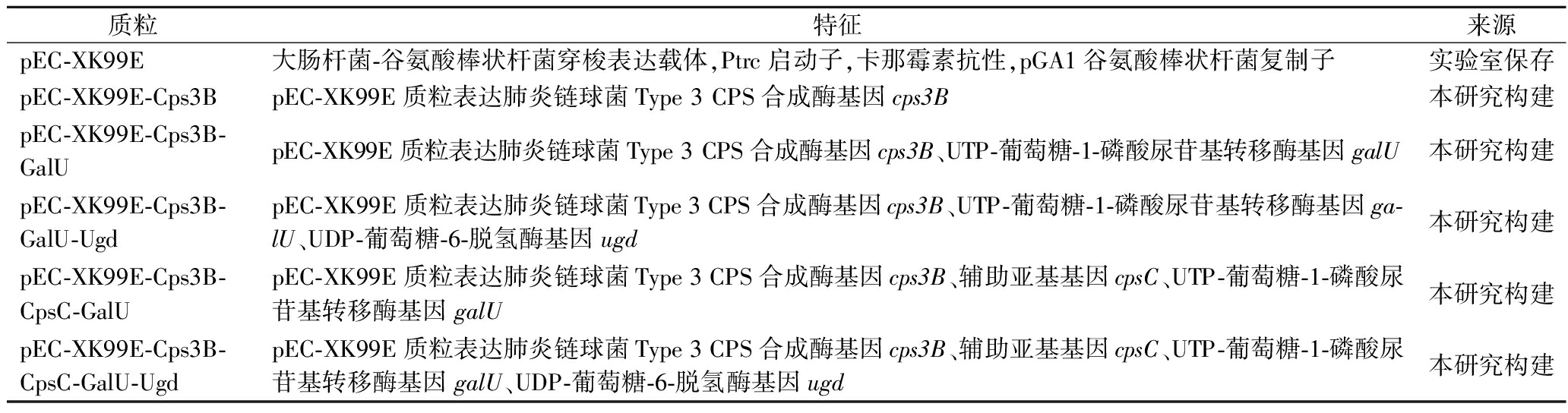 质粒特征来源pEC-XK99E大肠杆菌-谷氨酸棒状杆菌穿梭表达载体,Ptrc启动子,卡那霉素抗性,pGA1谷氨酸棒状杆菌复制子实验室保存pEC-XK99E-Cps3BpEC-XK99E质粒表达肺炎链球菌Type 3 CPS合成酶基因cps3B本研究构建pEC-XK99E-Cps3B-GalUpEC-XK99E质粒表达肺炎链球菌Type 3 CPS合成酶基因cps3B、UTP-葡萄糖-1-磷酸尿苷基转移酶基因galU本研究构建pEC-XK99E-Cps3B-GalU-UgdpEC-XK99E质粒表达肺炎链球菌Type 3 CPS合成酶基因cps3B、UTP-葡萄糖-1-磷酸尿苷基转移酶基因ga-lU、UDP-葡萄糖-6-脱氢酶基因ugd本研究构建pEC-XK99E-Cps3B-CpsC-GalUpEC-XK99E质粒表达肺炎链球菌Type 3 CPS合成酶基因cps3B、辅助亚基基因cpsC、UTP-葡萄糖-1-磷酸尿苷基转移酶基因galU本研究构建pEC-XK99E-Cps3B-CpsC-GalU-UgdpEC-XK99E质粒表达肺炎链球菌Type 3 CPS合成酶基因cps3B、辅助亚基基因cpsC、UTP-葡萄糖-1-磷酸尿苷基转移酶基因galU、UDP-葡萄糖-6-脱氢酶基因ugd本研究构建