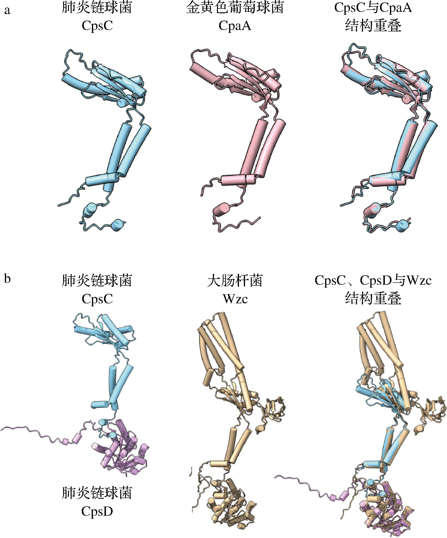 a-肺炎链球菌CpsC与金黄色葡萄球菌CpaA蛋白结构的比较;b-肺炎链球菌CpsC、CpsD与大肠杆菌Wzc蛋白结构的比较