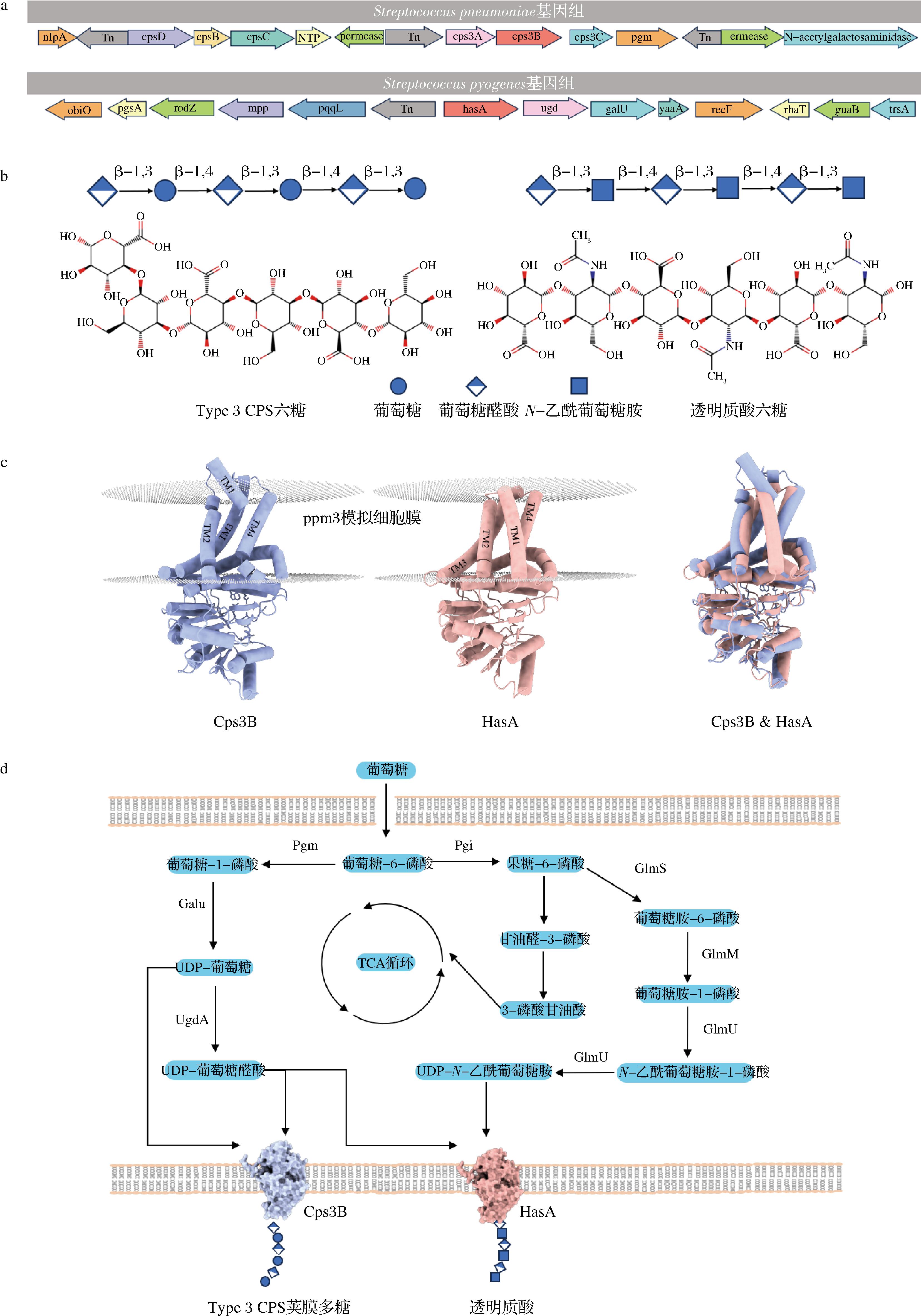 a-Type 3 CPS与HA的基因簇分析;b-Type 3 CPS与HA糖链结构比较;c-Type 3 CPS与HA合酶结构比较;d-Type 3 CPS与HA合成途径的比较