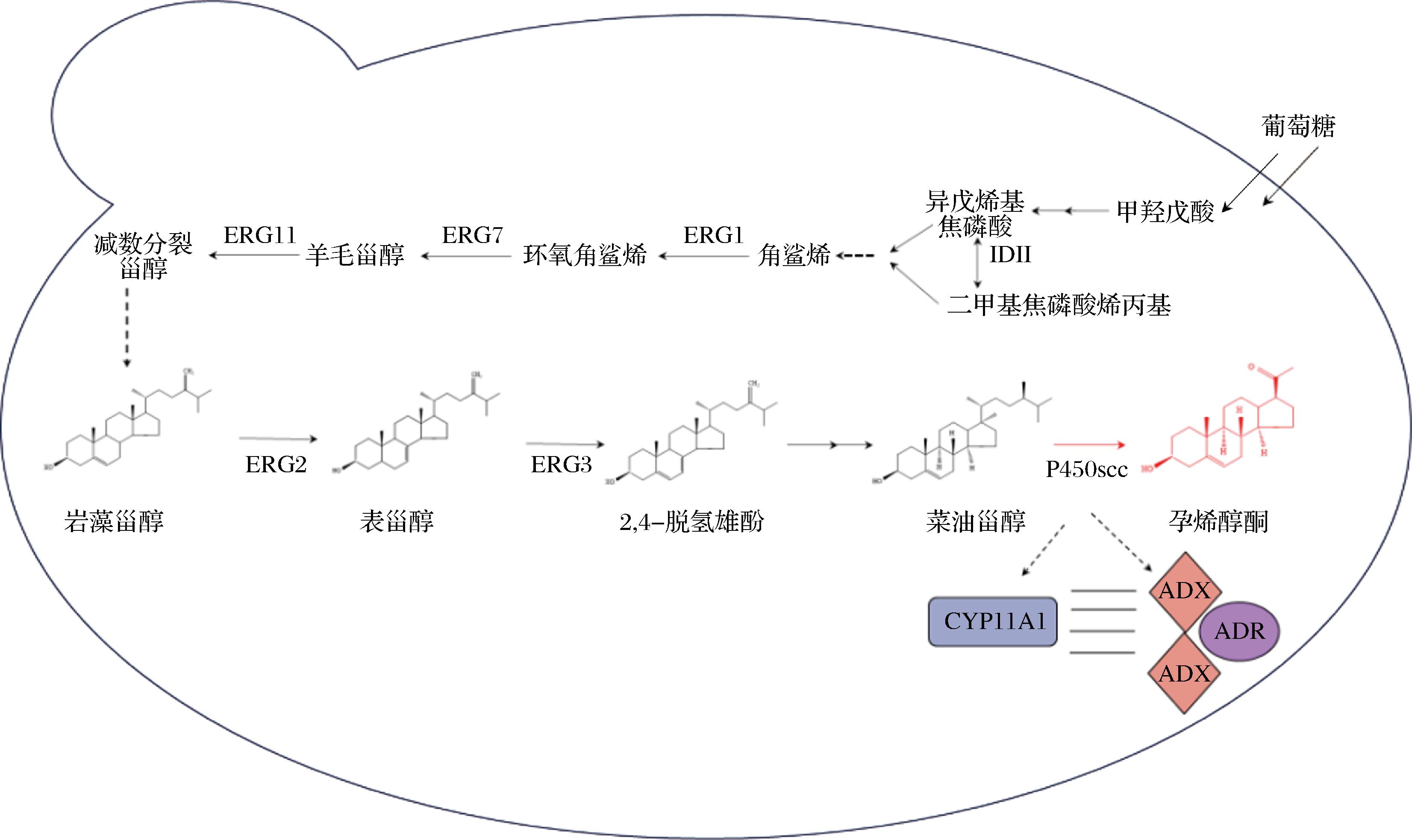 酿酒酵母作为一种经典真核模式微生物,在研究合成甾体化合物方面具有独特的优越性。其中,酿酒酵母细胞中含有最多的甾体化合物——麦角甾醇,这也是其细胞膜的重要成分[16]。目前基于合成途径抑制真菌麦角甾醇的抗真菌药物,其作用机理大多为抑制合成途径的多种酶[17]。然而,酿酒酵母体内的麦角固醇合成过程极为复杂,涉及约30种由ERG基因编码的酶,这些酶共同调控着麦角固醇的生物合成途径[18]。除此之外酿酒酵母合成麦角固醇仅在有氧条件下进行,并且会耗费大量的能量,在反应过程中需要大量ATP的消耗。酿酒酵母由于不能合成甾体而转变为甾体营养缺陷型细胞,在无氧条件下,必须依赖外源甾体的摄取,才能维持正常的生理机能[19-20]。因此,要想在酿酒酵母中合成孕烯醇酮,首先需要对ERG5基因进行敲除,将DHCR7进行整合,构建出一条酿酒酵母胞内菜油甾醇合成的途径。然后导入细胞色素P450 scc系统中单加氧酶CYP11A1降解菜油甾醇侧链,最后生成孕烯醇酮(图1)[21]。此外,酿酒酵母中天然存在的甲羟戊酸(mevalonate,MVA)途径可以提供直接的前体物质,用于合成甾体化合物[22]。受惠于这一特性,酿酒酵母中合成甾体化合物的反应步骤较少,且转化效率较高,这为其细胞工厂合成甾体化合物提供了便利。