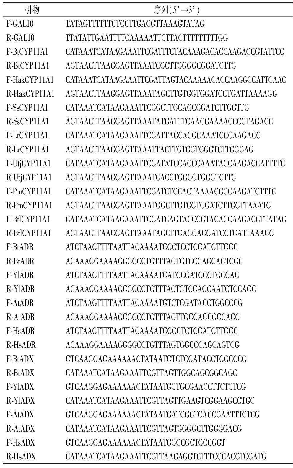 引物序列(5’→3’)F-GAL10TATAGTTTTTTCTCCTTGACGTTAAAGTATAGR-GAL10TTATATTGAATTTTCAAAAATTCTTACTTTTTTTTTGGF-BtCYP11A1CATAAATCATAAGAAATTCGATTTCTACAAAGACACCAAGACCGTATTCCR-BtCYP11A1AGTAACTTAAGGAGTTAAATCGCTTGGGGCGGATCTTGF-HakCYP11A1CATAAATCATAAGAAATTCGATTAGTACAAAAACACCAAGGCCATTCAACR-HakCYP11A1AGTAACTTAAGGAGTTAAATAGCTTGTGGTGGATCCTGATTAAAAGGF-SsCYP11A1CATAAATCATAAGAAATTCGGCTTGCAGCGGATCTTGGTTGR-SsCYP11A1AGTAACTTAAGGAGTTAAATATGATTTCAACGAAAACCCCTAGACCF-LrCYP11A1CATAAATCATAAGAAATTCGATTAGCACGCAAATCCCAAGACCR-LrCYP11A1AGTAACTTAAGGAGTTAAATTACTTGTGGTGGGTCTTGGGAGF-UtjCYP11A1CATAAATCATAAGAAATTCGATATCCACCCAAATACCAAGACCATTTTCR-UtjCYP11A1AGTAACTTAAGGAGTTAAATCACCTGGGGTGGGTCTTGF-PmCYP11A1CATAAATCATAAGAAATTCGATCTCCACTAAAACGCCAAGATCTTTCR-PmCYP11A1AGTAACTTAAGGAGTTAAATGGCTTGTGGTGGATCTTGGTTAAATGF-BtlCYP11A1CATAAATCATAAGAAATTCGATCAGTACCCGTACACCAAGACCTTATAGR-BtlCYP11A1AGTAACTTAAGGAGTTAAATAGCTTGAGGAGGATCCTGATTAAAGGF-BtADRATCTAAGTTTTAATTACAAAATGGCTCCTCGATGTTGGCR-BtADRACAAAGGAAAAGGGGCCTGTTTAGTGTCCCAGCAGTCGCF-YlADRATCTAAGTTTTAATTACAAAATGATCCGATCCGTGCGACR-YlADRACAAAGGAAAAGGGGCCTGTTTACTGTCGAGCAATCTCCAGCF-AtADRATCTAAGTTTTAATTACAAAATGTCTCGATACCTGGCCCGR-AtADRACAAAGGAAAAGGGGCCTGTTTAGTTGGCAGCGGCAGCF-HsADRATCTAAGTTTTAATTACAAAATGGCCTCTCGATGTTGGCR-HsADRACAAAGGAAAAGGGGCCTGTTTAGTGGCCCAGCAGTCGF-BtADXGTCAAGGAGAAAAAACTATAATGTCTCGATACCTGGCCCGR-BtADXCATAAATCATAAGAAATTCGTTAGTTGGCAGCGGCAGCF-YlADXGTCAAGGAGAAAAAACTATAATGCTGCGAACCTTCTCTCGR-YlADXCATAAATCATAAGAAATTCGTTAGTTGAAGTCGGAAGCCTGCF-AtADXGTCAAGGAGAAAAAACTATAATGATCGGTCACCGAATTTCTCGR-AtADXCATAAATCATAAGAAATTCGTTAGTGGGGCTTGGGGACGF-HsADXGTCAAGGAGAAAAAACTATAATGGCCGCTGCCGGTR-HsADXCATAAATCATAAGAAATTCGTTAAGAGGTCTTTCCCACGTCGATG