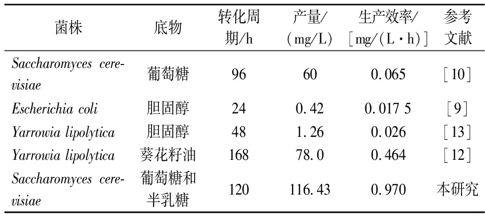 菌株底物转化周期/h产量/(mg/L)生产效率/[mg/(L·h)]参考文献Saccharomyces cere-visiae葡萄糖96600.065[10]Escherichia coli胆固醇240.420.017 5[9]Yarrowia lipolytica胆固醇481.260.026[13]Yarrowia lipolytica葵花籽油16878.00.464[12]Saccharomyces cere-visiae葡萄糖和半乳糖120116.430.970本研究