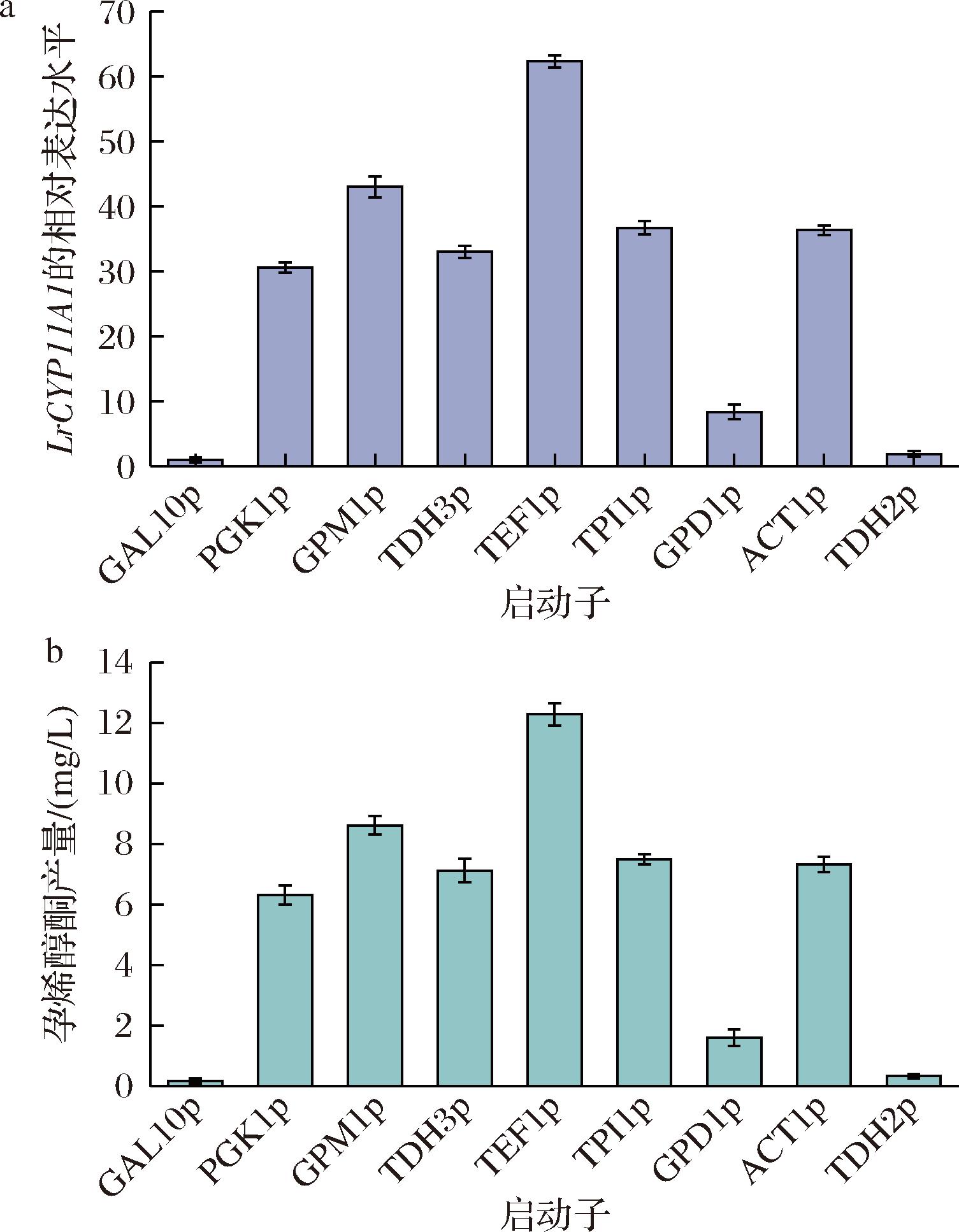 启动子是控制基因表达的关键元件,不同的启动子类型会导致转录强度的不同,进而影响目标基因的表达量。选取了8种酿酒酵母强启动子PGK1p、GPM1p、TDH3p、TEF1p、TPI1p、GPD1p、ACT1p和TDH2p,结合LrCYP11A1基因,精确调控LrCYP11A1的相对表达水平。通过荧光定量 PCR 技术检测各组合的转录水平,显示LrCYP11A1在原始诱导型启动子GAL10p的控制下,呈现极低的转录水平。相比之下,在强启动子TEF1p控制下,CYP11A1的转录水平提升很大,菌株CP614的孕烯醇酮产量达到12.28 mg/L,产量比对照菌株CP605(GAL10P启动子控制) 的CYP11A1基因表达量提高68.2倍。YPG摇瓶发酵的结果也显示,LrCYP11A1的转录水平与孕烯醇酮产量呈正相关。此外,菌株CP612和菌株CP615的孕烯醇酮产量也分别比对照菌株提高47.9 倍和40.7 倍(图5)。最终菌株CP614被选用于后续的实验。