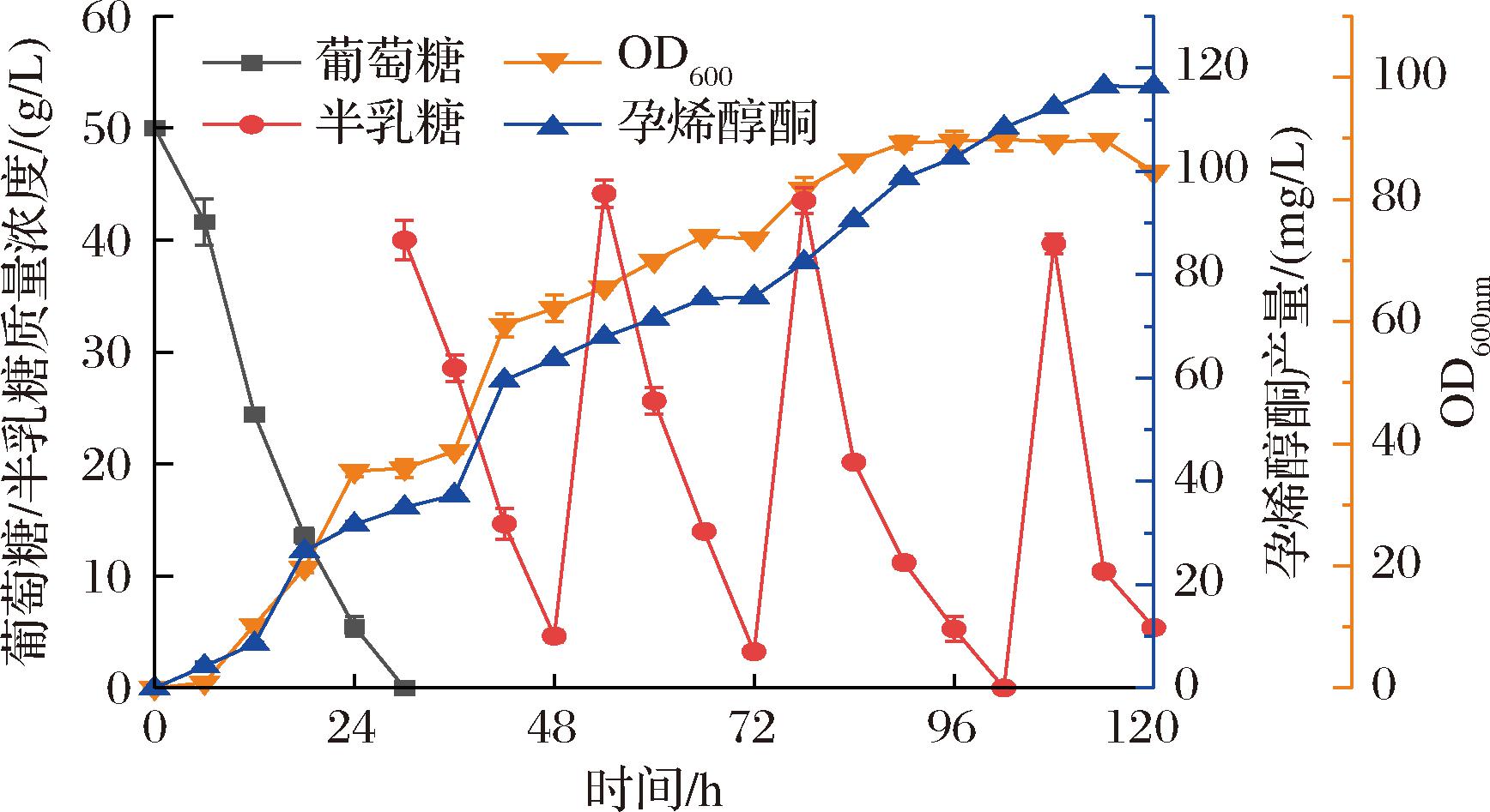 采用补料批量发酵策略进行菌株CP622高细胞密度发酵,反应在5 L生物发酵罐内进行。整个发酵过程分为2个阶段:第一阶段,以50 g/L葡萄糖为初始碳源,30 h后葡萄糖几乎完全消耗;接着进入第二阶段,加入半乳糖,诱导菌株内源酶表达MVA途径,促使孕烯醇酮在葡萄糖耗尽后合成。在半乳糖添加后,持续补充补料培养基,并在每24 h半乳糖接近耗尽时进行补加,以维持发酵体系的稳定性和高效性。最终经过120 h的连续发酵,重组菌株CP622的孕烯醇酮产量达到116.43 mg/L,收率为0.11%(以葡萄糖和半乳糖的原料总量计算),生产速率为0.97 mg/(L·h)(图7)。与先前研究相比,本研究为目前微生物法生产孕烯醇酮的最高产量,对比见表3。