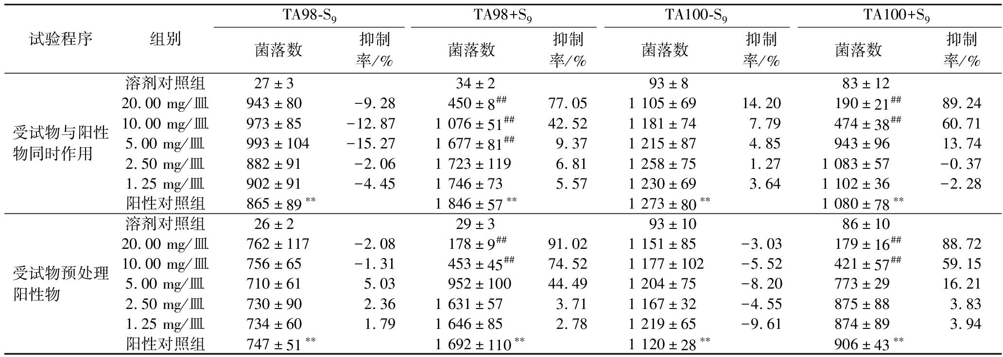 注:TA98-S9阳性物为敌克松,50 μg/皿;TA100-S9阳性物为叠氮钠,1.5 μg/皿;TA98+S9和TA100+S9阳性物均为2-氨基芴,10 μg/皿;**与溶剂对照组相比,超过溶剂对照组2倍以上;与阳性对照组相比,#P<0.05,##P<0.01。