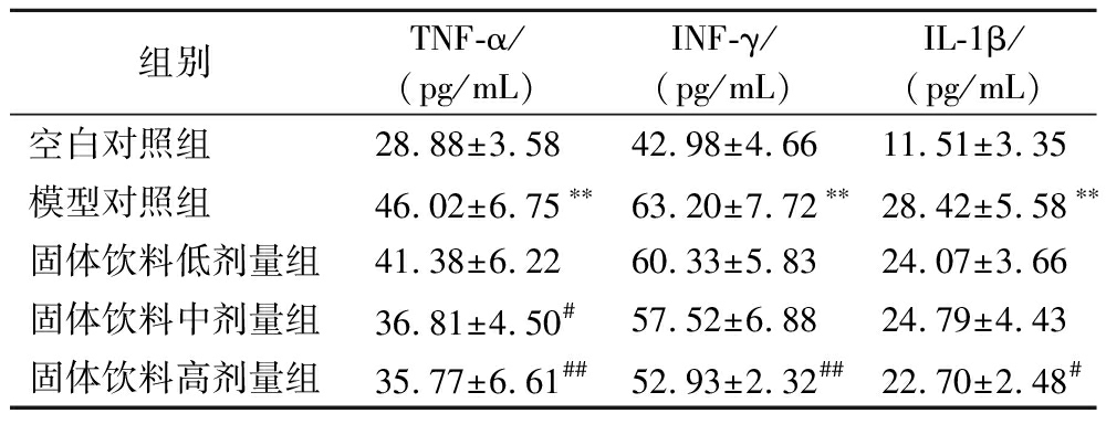 组别TNF-α/(pg/mL)INF-γ/(pg/mL)IL-1β/(pg/mL)空白对照组28.88±3.5842.98±4.6611.51±3.35模型对照组46.02±6.75∗∗63.20±7.72∗∗28.42±5.58∗∗固体饮料低剂量组41.38±6.2260.33±5.8324.07±3.66固体饮料中剂量组36.81±4.50#57.52±6.8824.79±4.43固体饮料高剂量组35.77±6.61##52.93±2.32##22.70±2.48#